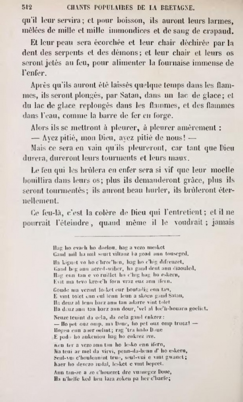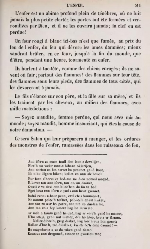 An tan zo a bep coste hac o devo ato.Ils hurlent à tue-tête, comme des gens enragés ; ils ne savent où fuir ; partout des flammes ! des flammes sur leur tête, des flammes sous leurs pieds, des flammes de tous côtés, qui les dévoreront à jamais.