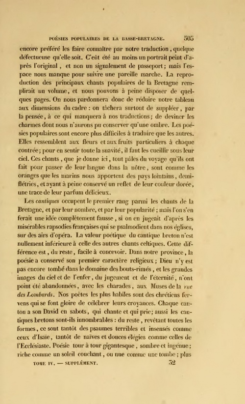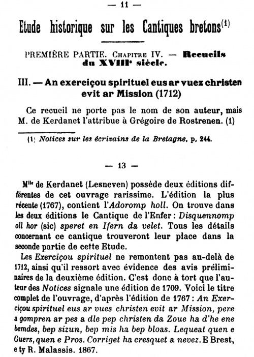 Différentes de celle du Barzaz Breiz, les deux versions de Dumoulin et de Grégoire de Rostrenen commencent de façon presque identique par un « Diskennomp oll a speret en ifern da velet » ou « Diskennomp oll hor speret en ifern da velet » : Descendons tous en (votre) esprit dans l'enfer. À comparer aussi avec la pièce satirique de Jean-Marie Déguignet parue dans ses Mémoires de paysan bas-breton : « Diskenit ol d'an ifern canaillez da wuelet » (Descendez tous en enfer, canailles, un peu voir). Avec cette version du paysan bouffeur de curé on est bien loin du texte du cantique initial. Emile Souvestre | |||||||||
