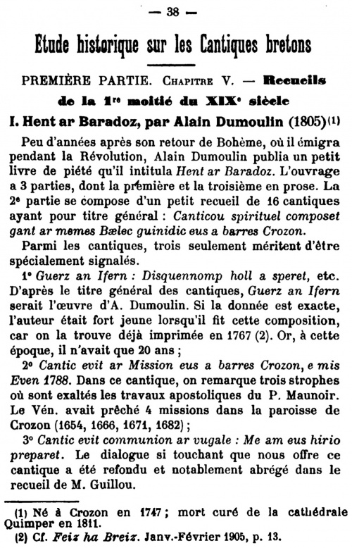 Alain Dumoulin, recteur réfractaire à Ergué-Gabéric au moment de la Révolution, est-il l'auteur du très connu Cantique de l'Enfer ? En tout cas, en 1804, il en a publié un texte complet dans un recueil intitulé « Hent ar barados », avec cette mention « Canticou spirituel composet gant ar memes baelec guinidic eus a barres Crozon » (Cantiques spirituels composés par le même prêtre natif de la paroisse de Crozon). C'est un cantique de 24 strophes de 4 vers, le tout en langue bretonne (agrémentée certes de quelques mots français d'inspiration religieuses, à savoir « tourmanchou, tourmant », « blasphemou », « eternite », « justiç » ...), alors que la version de Théodore Hersart de la Villemarqué publiée en 1839 ne compte que onze strophes (dont 9 sont incluses dans les 24 d'Alain Dumoulin). Les deux textes complets rapprochés, et les traductions en français, sont édités ci-après. De la Villemarqué considère que « pour trouver la société chrétienne telle qu’elle était jadis, une réunion d’hommes à natures primitives, à organisation puissante, à imagination dévorante ... il n’est pas nécessaire de remonter le cours du temps et d’aller jusqu’au moyen âge : on n’a qu’à venir en Bretagne » et y découvrir « le cantique de l’enfer, le plus ancien et le plus populaire ». Il précise aussi que son auteur est sensé être un grand missionnaire : « On l’attribue tantôt au père Morin De la Villemarqué mentionne une publication avant les écrits de Julien Maunoir sans préciser laquelle. Et il conclut : « la langue en est moins pure, l’allure moins franche, l’ensemble moins empreint de rudesse primitive. J’ai donc cru devoir suivre la version populaire ». |
