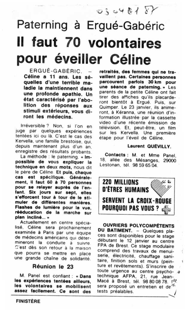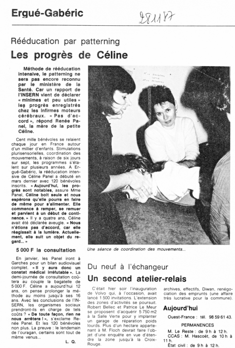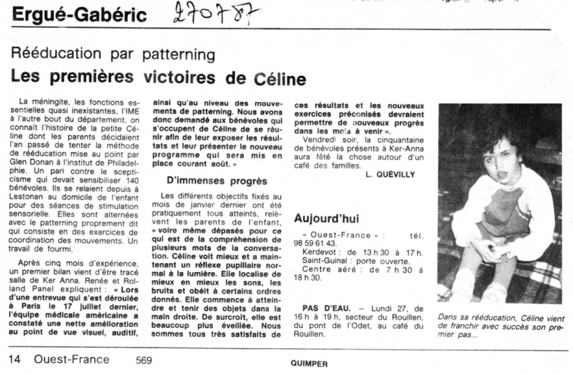 Le 3 et 7 janvier 1987, le 27 juillet, le 28 novembre, paraissaient dans les colonnes du Ouest-France des articles de Laurent Quevilly sur l'assistance à une petite fille prénommée Céline.