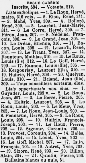 • En mai 1892 21 conseillers "Réactionnaires" : Le Roux Hervé (maire), René Lozac'h, Louis Le Roux, René Bolloré, Louis Rannou, Laurent Kergourlay, René Riou, Hervé Le Corre, François Nédelec, Hervé Huitric, François Le Dréau, Louis Bacon, Hervé Le Goff, Mathias Feunteun, Yves Le Tirant, Jean Briand, Jean-Marie Laurent, Jean Péron, Jean Le Grand, Louis Quelven, Yves Mahé.
