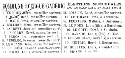 • Le 15 mai 1892 élection du maire et de deux adjoints : Hervé Le Roux (20 voix, élu), René Riou (1). Premier adjoint : René Riou (19 voix, élu), Louis Le Roux (2). Deuxième adjoint, premier tour : Yves Mahé (9), Hervé Le Goff (9), Louis Le Roux (3). Deuxième adjoint, deuxième tour : Yves Mahé (10), Hervé Le Goff (9), Louis Le Roux (2). Deuxième adjoint, troisième tour : Yves Mahé (11 voix, élu), Hervé Le Goff (8), Louis Le Roux (2).
