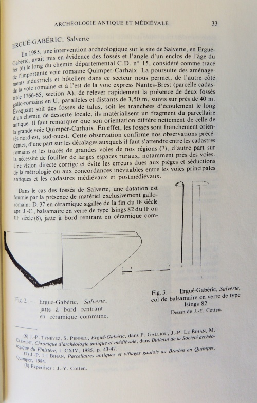 | Les compte-rendus de Jean-Paul Le Bihan sur cette intervention en 1987 près de l'échangeur de la voie expresse N165 faisant apparaître des fossés et matériels gallo-romains.