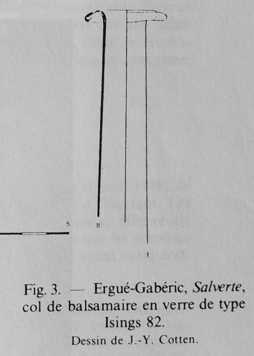 Sur ce site de nombreux objets typiques du IIe ou IIe siècle ont été exhumés : « Dans le cas des fossés de Salverte, une datation est fournie par la présence de matériel exclusivement gallo-romain : D. 37 en céramique sigillée de la fin du IIe siècle après J.-C., balsamaire en verre de type Isings 82 du IIe ou IIIe siècle (expertise J.Y. Cotten), jatte à bord rentrant en céramique commune, complète mais brisée sur place. » Ce rapport d'inventaire du bulletin de la société archéologique du finistère est aussi édité in-extenso dans le livre de référence « Archéologie de Quimper. Tome 2 », en chapitre 4 « d'autres établissements ruraux secondaires », avec en plus un cliché de la jatte à bord rentrant. |