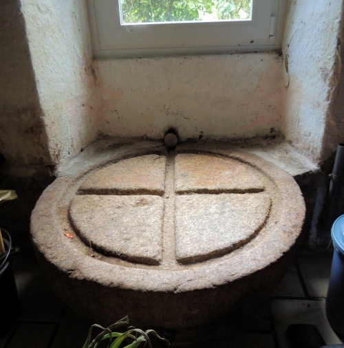 PENNARUN Une très belle pierre d'épaisseur conséquente et toujours placée en position opérationnelle dans l'arrière-cuisine avec évacuation des eaux usées à l'extérieur.