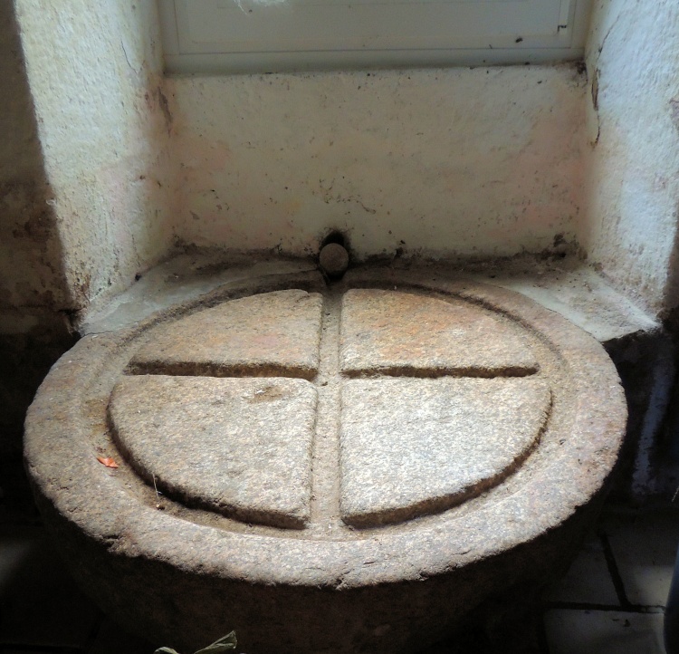 KERDILÈS Dans un jardin d'agrément de Kerdilès, pierre de 1 m x 20 cm. déversoir de 15 cm, rigole intérieure en croix. Cette pierre était auparavant à gauche du chemin d'entrée de la ferme des Signour.