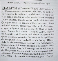 - Aveux et dénombrements de terres, de fiefs, de rentes, de convenants, de maisons, de châteaux, de droits réels et honorifiques, tenus noblement et roturièrement du Duc et du Roi, dans le ressort de la sénéchaussée de Quimper, sous les dénominations suivantes : le manoir de Lesergué, possédé par Charles de Coettanezre, écuyer, seigneur des Salles (1540); Marie de Coattanezre, femme de J. Autret (1550) ; G. Autret, seigneur de Missirien, et Blanche de Loheac, sa femme, lesquels déclarent en outre les manoirs de Quillihuec, de Gongallic alias Goffgallic, du bourg d'Ergué¬Gabéric, de Bossinsic, de Kerstrat et de Créachgongar, tous exploités à domaine congéable ou à simple fertile (1634 et 1652) ; Guy de Charmoy, fils de Sylvestre, et de Marguerite Autret, dont l'aveu comprend, outre Lesergué, Kernaon, Gongallic, Quillihuec et Bossinsic (1686) ;