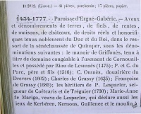- Aveux et dénombrements de terres , de fiefs , de rentes , de maisons, de châteaux, de droits réels et honorifiques tenus noblement du Duc et du Roi, dans le ressort de la sénéchaussée de Quimper, sous les dénominations suivantes : le manoir de Griffonnés, tenu à titre de domaine congéable à l'usement de Cornouailles et possédé par Riou de Lesmaës (1475) ; P. et C. du Parc, père et fils (1516) ; C. Omnés, douairière du Drevers (1602); Charles de Grassy (1637); Françoise de Grassy (1685); les héritiers de P. Lesparler, seigneur de Coëtcaris et de Tréguier (1730) ; Marie-Anne de Marigo, veuve de Lesparler, qui déclare aussi les Iieux de Kerbéren, Kernous, Guillenec et le moulin à eau de Griffonés (1752) ; le manoir de Kerangoan, par, Jean de Lierimerch, chevalier, et Amice de Kergorlay , sa femme (1454) ; J.Tréziguidv, seigneur des Salles (1458) ;