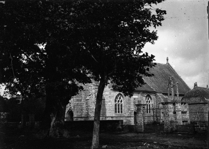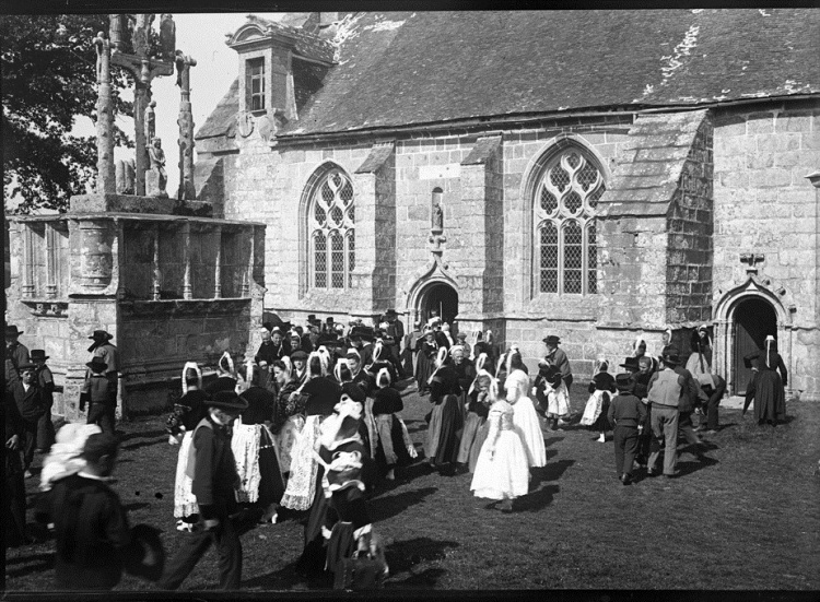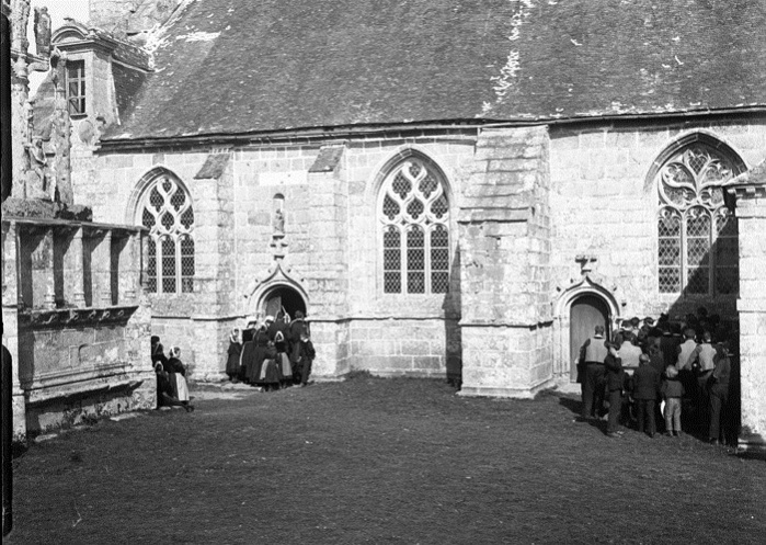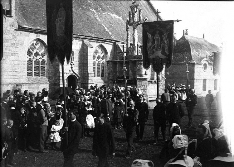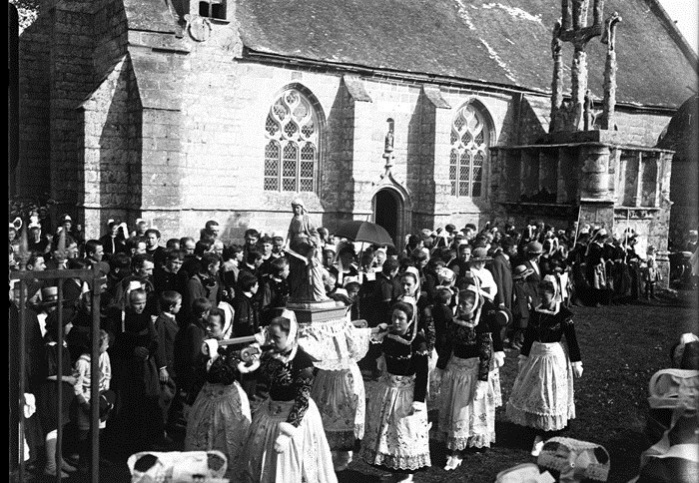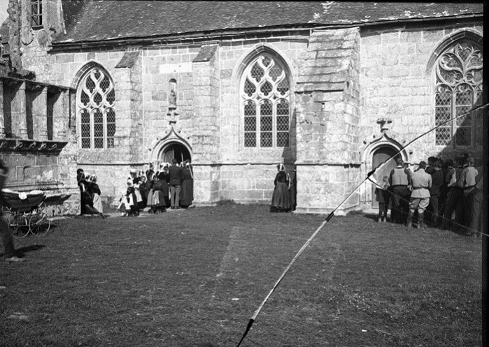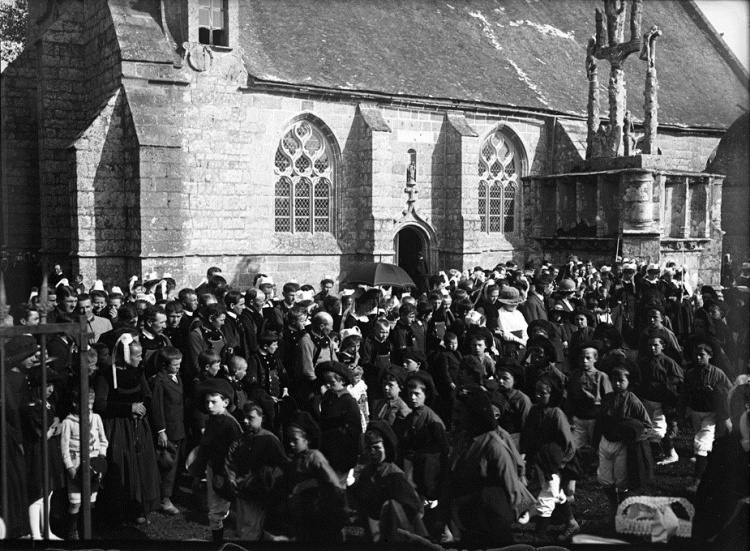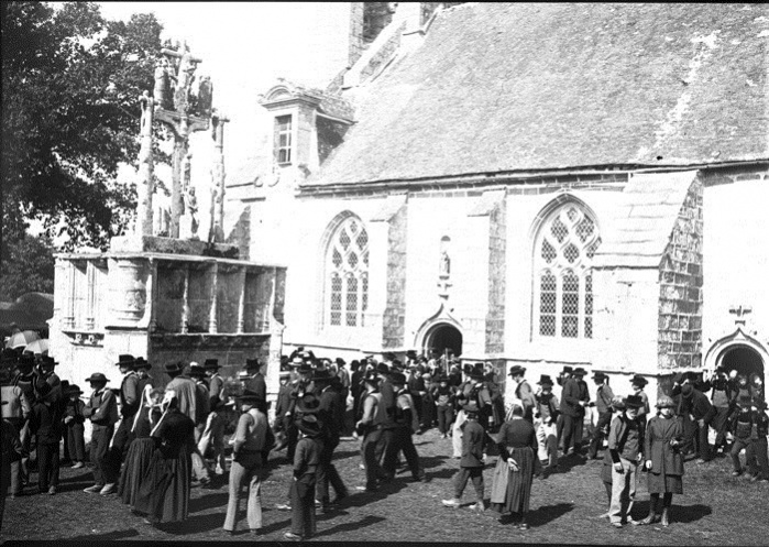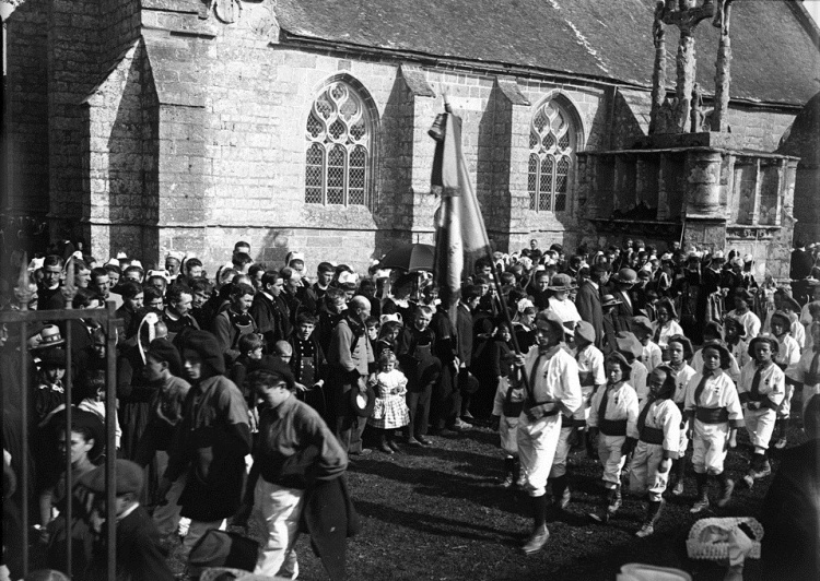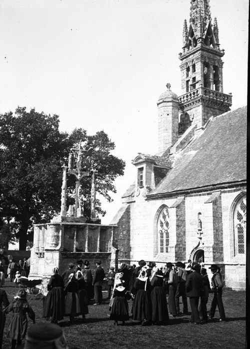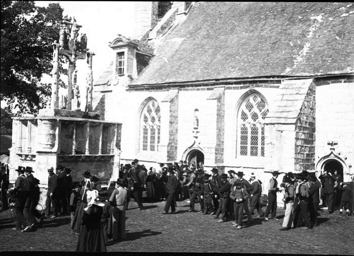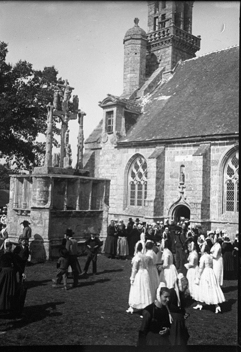 Jacques de Thézac (1862-1936), d'origine charentaise, épouse en 1888 une bretonne, Anne de Lonlay de Lanriec, et s'installe à Sainte-Marine où il se consacre aux reportages photographiques et activités philanthropiques. En 1908, il fonde l'Œuvre des Abris du Marin afin d'apporter instruction et divertissements aux marins. Refusant le pittoresque facile et ethnographe d’instinct, il photographie les marins de tous âges dans les abris, mais aussi les enfants jouant sur les quais, les fêtes religieuses et profane. En 1988, la Société des Abris du Marin, remet au Département du Finistère, pour les collections du Musée départemental breton, 4159 clichés sur plaques de verre de Jacques de Thézac, ceci afin d'assurer la conservation de ce fragile héritage. Parmi ces plaques de 85 mm x 120 mm en gélatino-bromure, vingt trois - cf. copies numériques ci-dessous - sont consacrées à un pardon Ce rassemblement populaire est plutôt la fête religieuse de l'Assomption, et non le grand pardon de septembre : d'une part les pèlerins s'abritent sous leurs parapluies contre une possible insolation de soleil aoûtien, et d'autre part il n'y a pas de fête profane et stands forains sur le parvis arboré. Plutôt qu'un « Kerfricot », la ferveur religieuse est de mise : des hommes assistent à la messe, debout ou agenouillés près de la porte sud-est proche de la sacristie, alors que les femmes entrent par l’autre porte. Les archivistes départementaux n'ont pas précisé l'année exacte, mais un « ca 1920 » (circa=environ) évasif. À noter que d'autres clichés de pardons photographiés par Jacques de Thézac, comme celui de Combrit, sont réputés dater de l'année 1925. D'où cet appel à identifier les participants à Kerdévot : reconnaissez-vous vos ancêtres ? Avec l'estimation de leur âge, on arrivera peut-être à déterminer le millésime. |