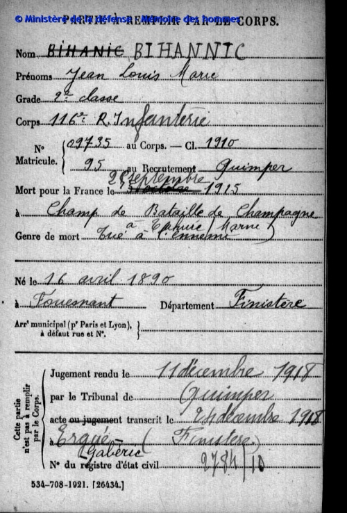 Et quelques jours plus tard : François Cloarec (29.09.1915, Perthes), Yves Riou (04.10.1915, Tahure), Pierre Marie Poriel (06.10.1915, Mesnil-Lès-Hurlus)