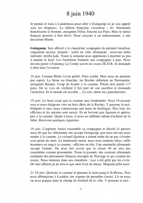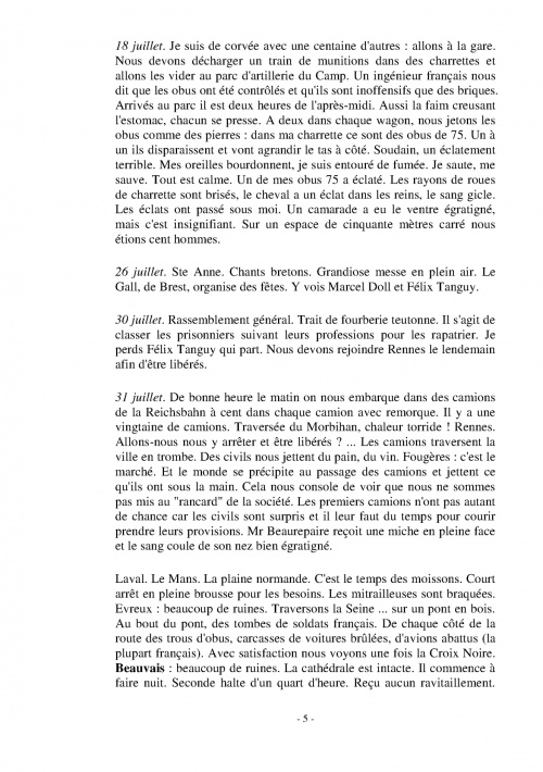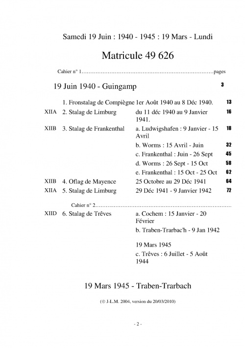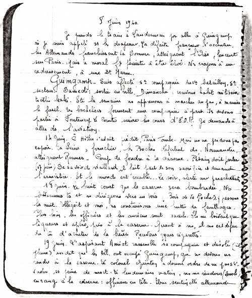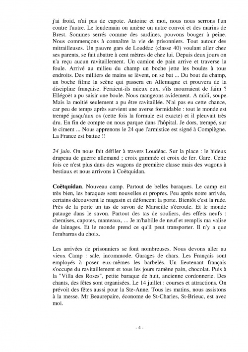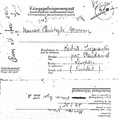 En juin 1940 Jean-Louis avait à peine 20 ans quand, après 19 jours de mobilisation, il dut, avec son régiment basé à Guingamp, se constituer prisonnier. De là commence un long voyage vers l'Allemagne où il passera par plusieurs stalags, kommandos, usines, fermes ... Pendant cinq années il consignera souvenirs et anecdotes dans des cahiers d'écoliers qui constituent aujourd'hui de véritables documents historiques. Autre article : « Jean-Louis Morvan, recteur d'Ergué-Gabéric » |