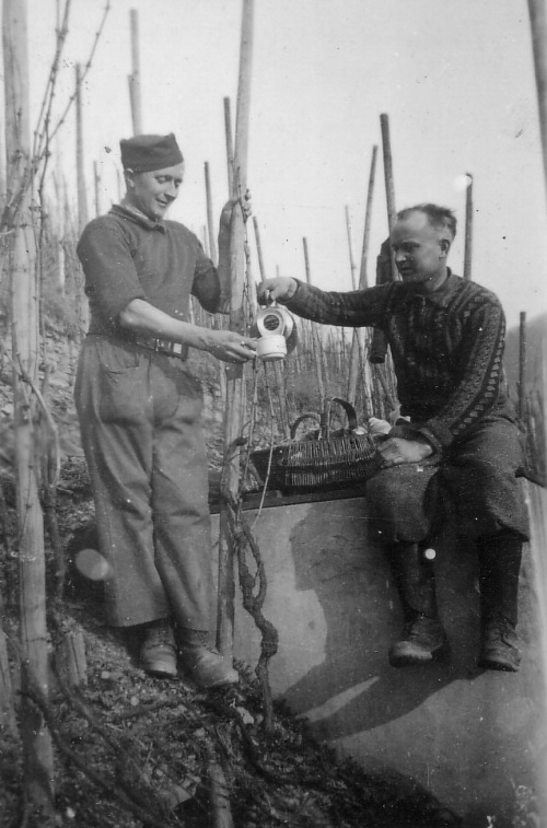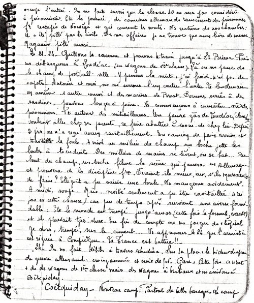Les transcriptions en ligne ci-dessous (sous forme de fichiers PDF téléchargeables) reprennent la version d'origine des cahiers à spirales : Le premier cahier fait 75 pages de petit format (+ 16 pages annexes) et est agrémenté de quelques photos. Il est intitulé "Mémoires du KG". Il démarre par la journée du 8 Juin 1940 et détaille la vie dans le Fronstalag de Compiègne, les Stalags de Limburg et de Frankenthal, et l'Oflag de Mayence, pour s'achever à la date du 7 janvier 1942. Le deuxième fait 69 pages (plus 6 pages complémentaires) et a pour titre "La captivité dure ... Vive la Joie ... Quand même ! ...". Il commence par la date du 9 janvier 1942 au Stalag de Trèves, à Traben-Trarbac'h, et se termine à Landerneau le 5 avril 1945. Ce qui frappe le lecteur de ses cahiers, c'est la spontanéité du prisonnier, et la fraîcheur de ses observations. Il dit et écrit tout haut ce qu'il pense. Et de cette spontanéité on devine une grande humanité, un sens de l'amitié et de la fraternité entre les peuples. Il dut travailler dur dans les champs, lui l'intellectuel, et affronter les idées nazies de certains de ses patrons de ferme. Et il souffrit physiquement lorsqu'il dut travailler à l'usine IG Farben-Industrie Ludwigshafen où il devait porter des sacs de soude de 100kg. |