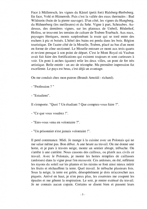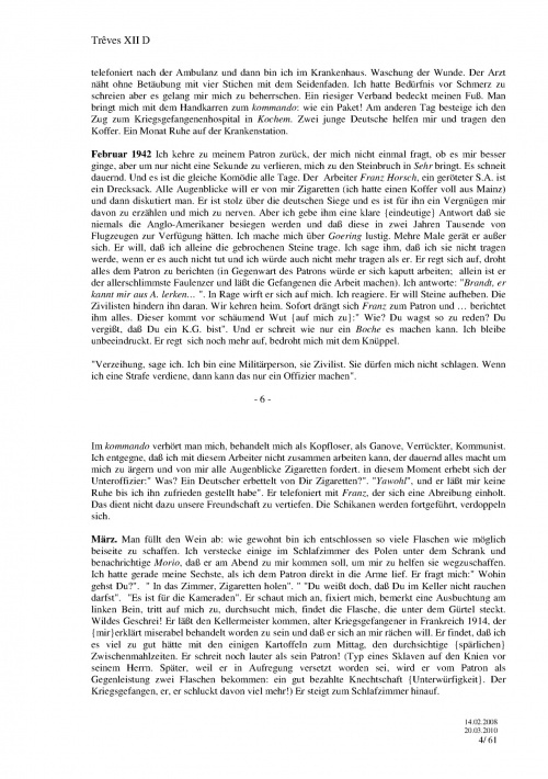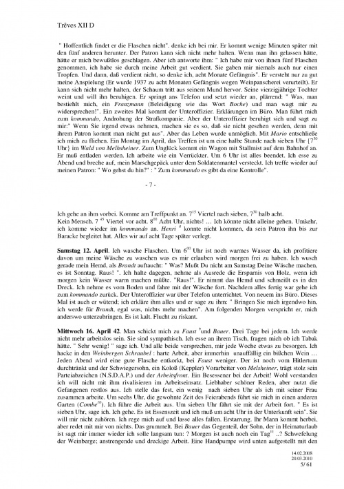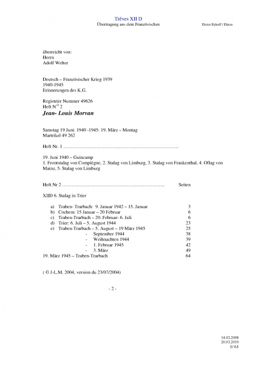 En 2008 Dieter Eyhoff de la ville de Duren en Allemagne fut appelé en tant que traducteur par Adof Welter, historien, qui cherchait et étudiait des témoignages sur le stalag XII D de Trèves comptant 30.000 hommes de différentes nationalités en 1942, et qui lui demanda de traduire en allemand les passages sur le kommando 322 A de Traben-Trarbach. Dieter Eyhof se prit au jeu et traduisit les quelques 72 pages du cahier n° 2 et donc voici la version téléchargeable en pdf, avec comme titre « Erinnerungen des K.G. » : « Heft nr 2 (1942-1945) ». En début d'année 2010, il reprit la traduction et acheva le cahier n° 1 : « Heft nr 1 (1940-1942) ». |