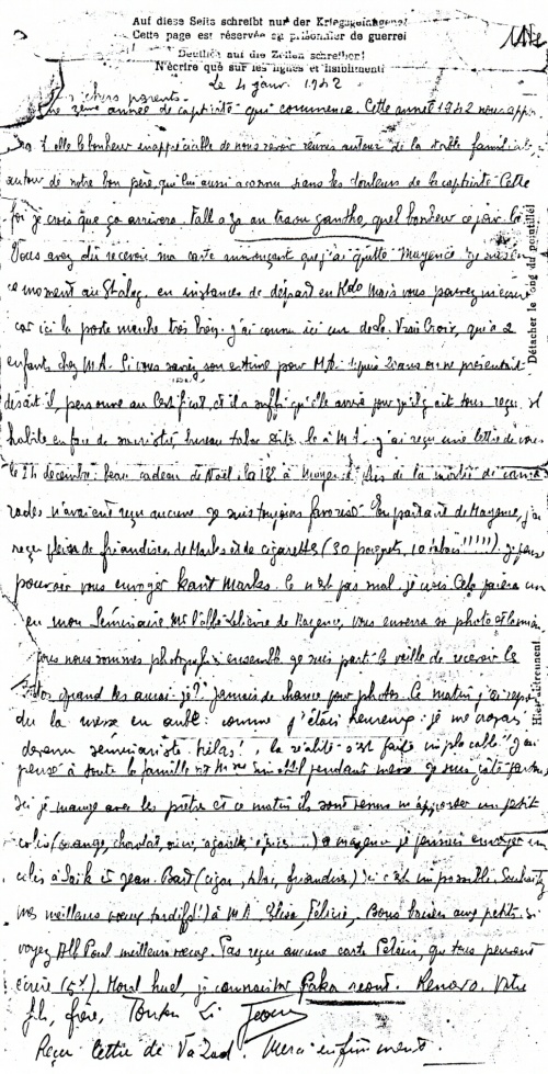 La photo n° 3 ci-dessus a été prise en février 1942 à Traben-Trarbach. Jusqu'en 1943 Jean-Louis a porté "fièrement" cette Croix de Lorraine, symbole de la résistance. Il faisait croire aux Allemands que c'était uniquement une croix catholique. Elle lui a été enlevée par un soldat allemand qui revenait de France. Ci-contre, un autre acte de "bravoure" de Jean-Louis, passer des messages en breton à sa famille, en plein milieu d'une lettre anodine en française qui passait par la censure allemande :