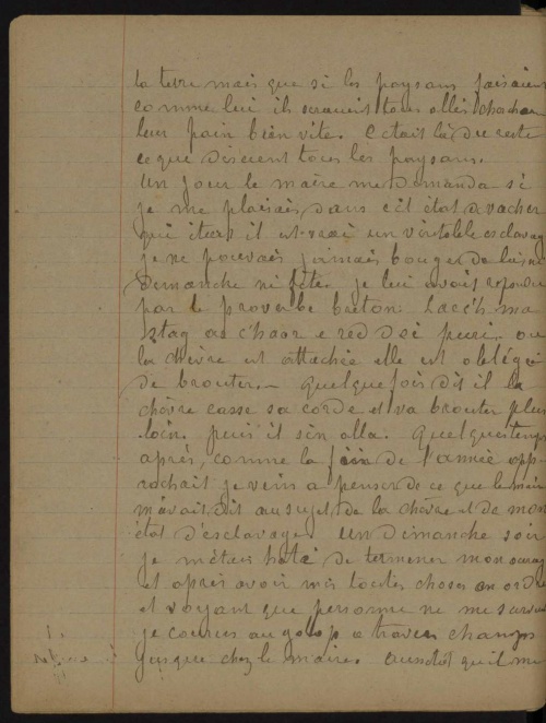 Un jour, le maire me demanda si je me plaisais dans cet état de vacher qui était, il est vrai, un véritable esclavage. Je ne pouvais jamais bouger de là, ni dimanche ni fête ; je lui avais répondu par le proverbe breton : « El lec'h m'emañ stag ar c'havr eo ret dezhi peuriñ » [1] ("où la chèvre est attachée, elle est obligée de brouter"). « Quelquefois, dit-il, la chèvre casse sa corde et va brouter plus loin. » Puis il s'en alla. Quelque temps après, comme la fin de l'année approchait, je vins à penser de ce que le maire m'avais dit au sujet de la chèvre et de mon état d'esclavage. Un dimanche soir, je m'était hâté de terminer mon ouvrage et après avoir mis toutes choses en ordre, et voyant que personne ne me surveillait, je courus au galop à travers champs jusque chez le maire. Aussitôt qu'il me vit, il me dit :