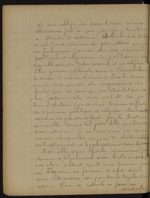 En politique, je suis un républicain des plus avancés, et en religion, libre-penseur, philosophe, ami de l'humanité, de la vraie, et ennemi déclaré de tous les dieux qui ne sont que des êtres imaginaires, et des prêtres qui ne sont que des charlatans, et des fripons, cela vous va-t-il ?
