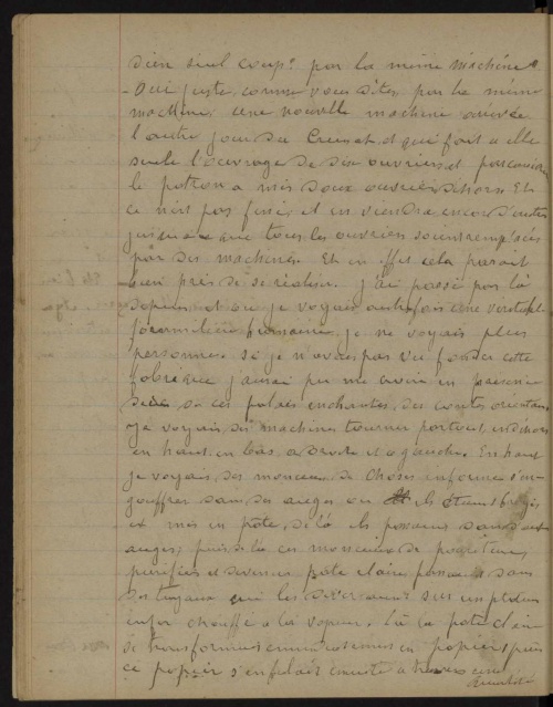 Enfin je sortis de ce vaste palais enchanté, émerveillé du génie de l'homme, mais aussi attristé en considérant que ce génie va à l'encontre du but vers lequel il devrait tendre, c'est-à-dire à égaliser un peu le bonheur en ce monde entre tous les individus tandis qu'il tend au contraire à accabler de richesses et de bonheur quelques privilégiés seulement, en en éloignant de plus en plus des millions de malheureux déshérités à qui, comme disait cet ouvrier renvoyé de la fabrique, les machines coupent les bras tous les jours, leur seule fortune en ce monde.