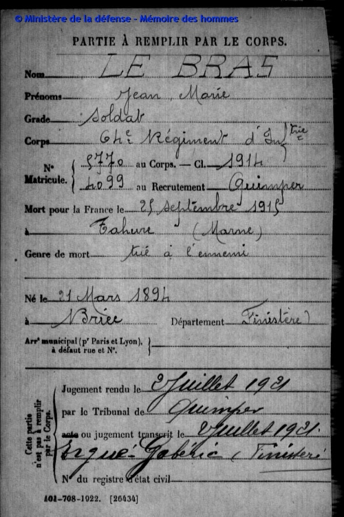 Un jeune soldat de 20 ans mort à Tahure dans la Marne le 25 septembre 1915, le jour même de la toute première offensive lors de la seconde bataille de Champagne On trouvera ci-dessous la relation de cette journée dans le Journal des Marches et Opérations du 64e Régiment d'Infanterie, ainsi que les infos généalogiques et biographiques du soldat, et une photographie familiale inédite où on le voit quelques mois avant son incorporation militaire. Autres lectures : « Portail des Poilus de 1914-18 » ¤ « René-Marie Le Bihan (1888-1915), soldat du 2e RIC » ¤ « Corentin Le Gall (1893-1915), soldat du 116e RI » ¤ « Jean-Louis Bihannic (1890-1915), soldat du 116e RI » ¤ « 1919 - Les deux mariages des soeurs Le Bras » ¤ « 1915-1919 - Les combats de Pierre Tanguy en Marne, Somme, Aisne, Meuse et Allemagne » ¤ « DOUGUET Jean-François - Etienne Le Grand, un regard breton dans la Grande Guerre » ¤ « DOUGUET Jean-François - Ergué-Gabéric dans la Grande Guerre T1 » ¤ « DOUGUET Jean-François - Cornouaillais dans la Grande Guerre T2 » ¤ |