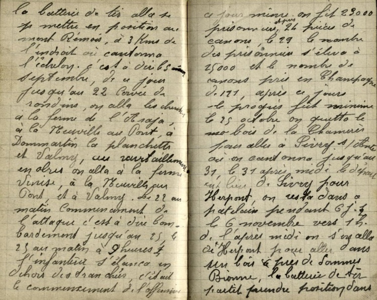 Page 16 - la batterie de tir alla se mettre en position au mont Rémois, à 3 kms de l'endroit où cantonna l'échelon, c'est à dire le 5 septembre, de ce jour jusqu'au 22 corvée de rondins, on alla les chercher à la ferme de l'Asaja, à la Neuville au Pont, à Dommartin la planchette et Valmy, au ravitaillement en obus on alla à la ferme Venise, à la Neuville du Pont, et à Valmy. Le 22 au matin commencement de l'attaque, c'est à dire bombardement jusqu'au 25, le 25 au matin à 9 heures l'infanterie s'élança en dehors des tranchées, c'était le commencement de l'offensive,