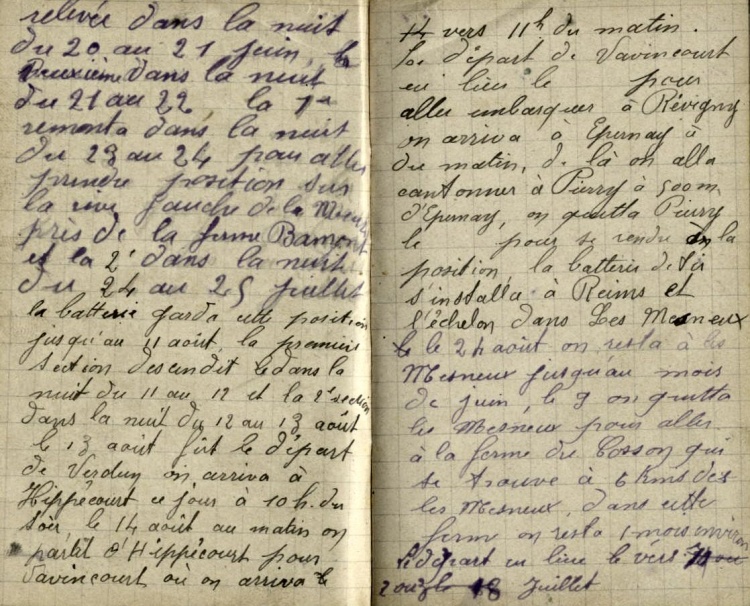 Page 25 - 14 vers 11 h du matin. Le départ de Vavincourt eu(t) lieu le x pour aller embarquer à Révigny on arriva à Epernay à x heures du matin, de là on alla cantonner à Pierry à 500 m d'Epernay, on quitta Pierry le x pour se rendre en position, la batterie de tir s'installa à Reims et l'échelon dans Les Mesneux. Le 24 aôut on resta à les Mesneux jusqu'au mois de juin, le 9 on quitta les Mesneux pour aller à la ferme de Cosson qui se trouve à 6 kms des les Mesneux, dans cette ferme on resta un mois environ, le départ eu(t) lieu vers le 18 juillet