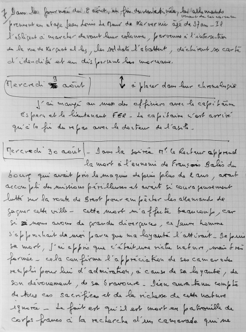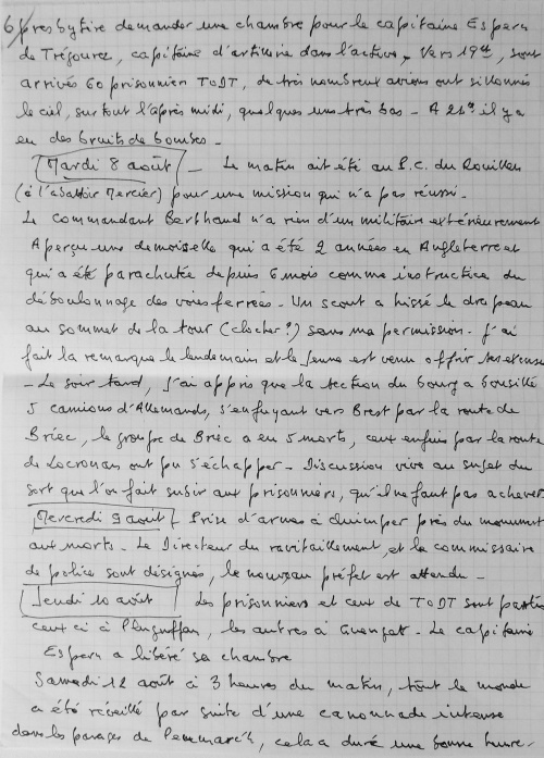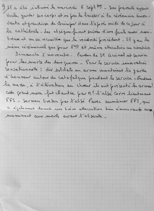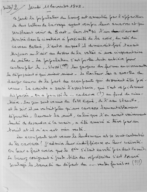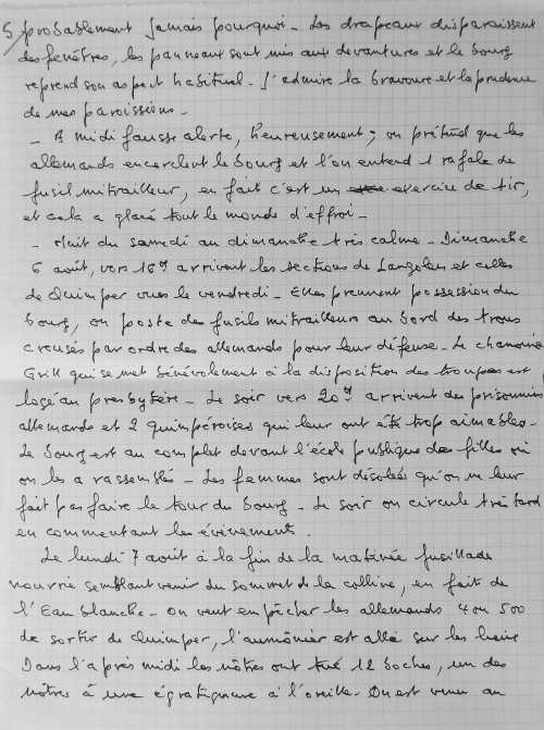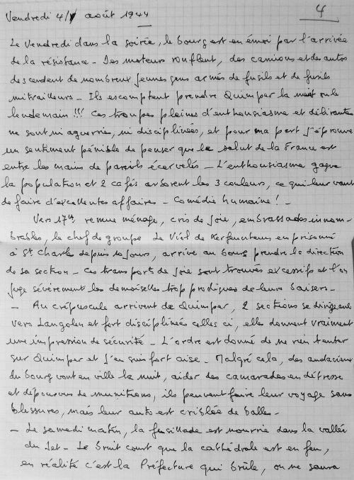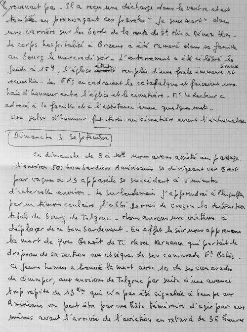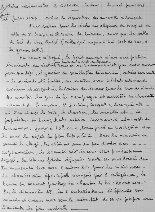 Juillet 1943, travail de Jean Guéguen Jeudi 15 Juillet 1943. Ordre de réquisition des autorités allemandes d'occupation pour les écoles des religieuses du bourg et de celles de St Joseph et Ste Marie de Lestonan, ainsi que la salle de bal de chez Quéré (celle qui aujourd'hui sert de bar, à la grande salle). Au bourg d'Ergué, le bruit courait d'une occupation imminente des écoles par suite de la visite des locaux, mais on ne s'émotionnait pas outre mesure, parce que déjà il y avait de semblables démarches, restées sans suite. Le vendredi 16 juillet, au matin trois soldats allemands arrivent et exigent la livraison des locaux pour le samedi à midi. On avertit les gens de la campagne et aussitôt des charrettes viennent de Pennarun, St Joachim, Congallic, Lezergué etc. et l'on charge le bois, le charbon, les meubles etc. La population du bourg toute entière s'est montrée admirable de dévouement. Jusqu'à 23 h on a transporté au presbytère dans la cour, les objets les plus hétéroclites. Dans la matinée du samedi le clergé, les abbés ont mis un peu d'ordre dans ce capharnaüm, le samedi soir la cour était parfaitement dégagée, les lits des filles réfugiées brestoises sont dressés dans les mansardes nord avec 2 autres lits pour les maîtresses. La chambre dite épiscopale occupée par 2 religieuses, la bonne du couvent partage la chambre de la "karabassen". Dès le dimacnche 18, les 2 installations différentes sont achevées et chacun vivra sous le même toit de sa vie propre dans l'entente la plus cordiale. Jeudi 11 novembre 1943 Ce jeudi la population du bourg est ameutée par l'apparition de deux ballons de barrage ayant rompu leurs amarres et qui semblaient venir de Brest. Vers 14 h 30 l'un d'eux est tombé dans le cimetière à proximité de la croix, du côté du caveau Bolloré, l'autre auquel il demeurait fixé tenait toujours en l'air au dessus de la vallée à une cinquantaine de mètres. La population s'est portée toute entière pour contempler ... le blessé. Les garçons des fermes avoisinantes le dépeçaient à qui mieux mieux. Le Recteur les a avertis du danger couru de la part des occupants qui devaient être prévenus. La crainte a saisi l'assistance, qui s'est rapidement dispersée. On a poussé le ... cadavre au fond du cimetière. Des gens sont venus du Petit Ergué, de l'Eau Blanche, et le soir il ne restait plus qu'une carcasse lamentablement dépouillée. Durant la nuit, celui que l'on avait vainement tenté de descendre à la main, a été amené à terre et il n'en est rien resté. Les occupants sont venus le lendemain et se sont contentés de la carcasse ! J'admire leur indifférence ou leur naïveté. On leur a fait croire que le 2e s'était envolé pendant la nuit. Le bourg craignant à juste titre des représailles s'est trouvé soulagé le samedi au départ des ... restes funèbres (!!!). Août 1944, travail de Jean Guéguen 1944. 28 mai. 6 juin. Retraite adoration au bourg. Le lundi 6 juin, messe de communion des hommes, à l'issue de laquelle l'on a appris le débarquement Anglais, dans le Nord à Caen, le soir on a été mieux fixé. Le 25 juin, un jeune réfugié de Lorient, Jacques Le Mouël a été affreusement blessé par une grenade au Rouillen, à quelques mètres plus bas que la maison André, sur la route de Squividan. Diverses versions. 1) Il s'amusait avec cette grenade avec d'autres compagnons comme avec une balle. 2) Il a voulu éviter que de jeunes enfants la touchent (???=. En fait, il a eu la main emportée, les poumons perforés, transporté à l'hôpital, on lui a amputé la main, sans l'endormir, il est mort le lundi à 13 h et a été enterré le lendemain. Le jeudi 4 août, un train a déraillé sur la voie à 50 mètres en aval de la station signalétique, plusieurs wagons étaient remplis de petits morceaux de bois bien sec pour gazogène. Dès le soir et toute la matinée du lendemain, des brouettes, des charrettes à bras, de grosses charrettes sillonnaient les prairies environnantes pour prendre leur part de butin et, sous une chaleur tropicale, transportent à domicile la provision hivernale. Pour l'honneur de l'humanité l'on eût souhaité que les riches laissent aux pauvres le soin de profiter de l'aubaine. Hélas ! l'humanité n'est pas belle. Vendredi 4 août 1944. Le vendredi dans la soirée, le bourg est en émoi par l'arrivée de la résistance. Des moteurs ronflent, des camions et des autos descendent de nombreux jeunes gens armés de fusils et de fusils mitrailleurs. Ils escomptent prendre Quimper la nuit ou le lendemain !!! Ces troupes pleines d'enthousiasme et délirantes ne sont ni aguerries, ni disciplinées, et pour ma part j'éprouve un sentiment pénible de penser que le salut de la France est entre les mains de pareils écervelés. L'enthousiasme gagne la population et deux cafés arborent les 3 couleurs, ce qui leur vaut de faire d'excellentes affaires. Comédie humaine ! Vers 17h, remue-ménage, cris de joie, embrassades innombrables, le chef de groupe Le Viol de Kerfeunteun, emprisonné à St Charles depuis 10 jours, arrive au bourg prendre la direction de sa section. Ces transports de joie sont trouvés excessifs et l'on juge sévèrement les demoiselles trop prodigues de leurs baisers. Au crépuscule arrivent de Quimper 2 sections se dirigeant vers Langolen et fort disciplinées celles-ci, elles donnent vraiment une impression de sécurité. L'ordre est donné de ne rien tenter sur Quimper et j'en suis fort aise. Malgré cela, des audacieux du bourg vont en ville le nuit aider des camarades en détresse et dépourvus de munitions, ils peuvent faire leur voyage sans blessures, mais leur auto est criblée de balles. Le samedi matin, la fusillade est nourrie dans la vallée du Jet. Le bruit court que la cathédrale est en feu, en réalité c'est la Préfecture qui brûle, on ne saura probablement jamais pourquoi. Les drapeaux disparaissent des fenêtres, les panneaux sont mis aux d