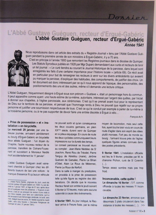 Gustave Guéguen, surnommé "Gustave" par tout le monde, a été recteur de la paroisse d'Ergué-Gabéric pendant une quinzaine d'années de 1941 à 1956. Il a tenu un registre-journal, conservé actuellement aux Archives Diocésaines, dans lequel il parlait de lui alternativement à la 3e personne (« le Recteur arriva à l'heure fixée ») et la 1ère personne (« je viens d'apprendre que ... »). Il y notait tout, des détails "techniques", mais aussi ses états d'âmes et coups de gueule. |