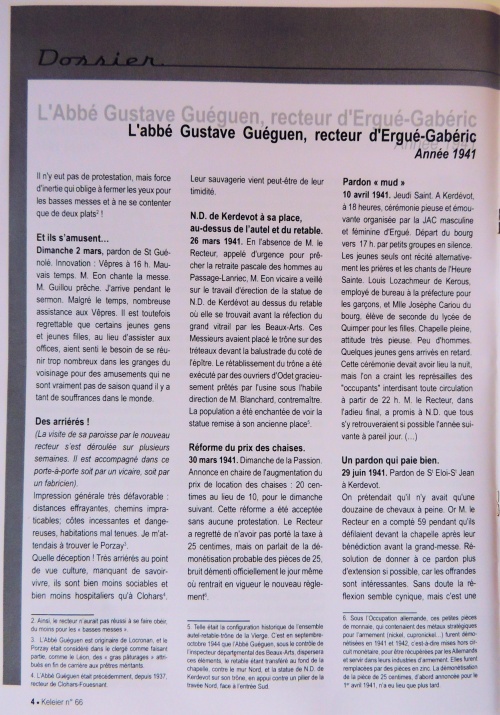 Année 1941, travail de Fanch Ach (Arkae) Le mercredi 29 janvier, par une radieuse journée, arrivaient péniblement au bourg d'Ergué-Gabéric en bicyclette deux abbés Guéguen : l'un doyen du Chapitre, l'autre nouveau recteur de la paroisse, transféré de Clohars-Fouesnant et succédant à Monsieur Neildé mort accidentellement le 11 janvier L'abbé Gustave Guéguen avait vainement cherché à Quimper chez les différents loueurs de taxi une voiture : le manque d'essence fit qu'aucun véhicule ne pouvait sortir et qu'en conséquence les deux cousins germains, en plein XXe siècle, durent venir de Quimper en si piteux équipage. En cours de route les deux cyclistes communiquaient leurs impressions sur la dureté des temps. Le conseil paroissial se trouvait réuni au complet : Jean-Marie Nédélec de Saint-Joachim, René Riou de Tréodet, Pierre Tanguy de Kérellou (maire), Jérôme Quelven de Garsalec, Pierre Le Bihan d'Odet, Alain Le Roux de Mélennec, Pierre Le Roux de Kerfort. Dans la salle à manger du presbytère, on procéda à la prise de possession telle qu'elle figure au registre des délibérations. On décida que le nouveau Recteur ferait son entrée le jeudi suivant 6 février à 15 heures, mais sans aucune solennité à cause des évènements. 6 février 1941. Au jour indiqué, le Recteur arriva à l'heure fixée, par le même moyen de locomotion, mais seul cette fois, ayant tout le loisir voulu en cours de route d'agiter dans son esprit des idées plutôt moroses. Fort peu de monde au bourg : l'arrivant trouva près de l'église quelques figures amies connues dans des postes précédents. 9 février 1941. L'installation officielle eut lieu le 9 février, présidée par M. le chanoine Pichon, curé de Saint-Corentin (…). Temps assez sombre mais pas trop froid. Inconcevable, cette quête ! Le dimanche 16 février : 5 F. comme offrande à toutes les messes !!! Inconcevable. Le dimanche 23 février, annonce que désormais 3 plats circuleront dans l'assistance à toutes les messes (…). Il n'y eut pas de protestation, mais force d'inertie qui oblige à fermer les yeux pour les basses messes et à ne se contenter que de deux plats Dimanche 2 mars, pardon de Saint-Guénolé. Innovation : Vêpres à 16 h. Mauvais temps. M. Eon chante la messe. M. Guillou prêche. J'arrive pendant le sermon. Malgré le temps, nombreuse assistance aux Vêpres. Il est toutefois regrettable que certains jeunes gens et jeunes filles, au lieu d'assister aux offices, aient senti le besoin de se réunir trop nombreux dans les granges du voisinage pour des amusements qui ne sont vraiment pas de saison quand il y a tant de souffrances dans le monde. Des arriérés ! (La visite de sa paroisse par le nouveau recteur s’est déroulée sur plusieurs semaines. Il est accompagné dans ce porte-à-porte soit par un vicaire, soit par un fabricien). Impression générale très défavorable : distances effrayantes, chemins impraticables; côtes incessantes et dangereuses, habitations mal tenues. Je m'attendais à trouver le Porzay Quelle déception ! Très arriérés au point de vue culture, manquant de savoir-vivre, ils sont bien moins sociables et bien moins hospitaliers qu'à Clohars N.D. de Kerdevot à sa place, au-dessus de l’autel et du retable. 26 mars 1941. En l'absence de M. le Recteur, appelé d'urgence pour prêcher la retraite pascale des hommes au Passage-Lanriec, M. Eon vicaire a veillé sur le travail d'érection de la statue de Notre-Dame de Kerdévot au dessus du retable où elle se trouvait avant la réfection du grand vitrail par les Beaux-Arts. Ces Messieurs avaient placé le trône sur des tréteaux devant la balustrade du coté de l'épître. Le rétablissement du trône a été exécuté par des ouvriers d'Odet gracieusement prêtés par l'usine sous l'habile direction de M. Blanchard, contremaître. La population a été enchantée de voir la statue remise à son ancienne place Réforme du prix des chaises. 30 mars 1941. Dimanche de la Passion. Annonce en chaire de l'augmentation du prix de location des chaises : 20 centimes au lieu de 10, pour le dimanche suivant. Cette réforme a été acceptée sans aucune protestation. Le Recteur a regretté de n'avoir pas porté la taxe à 25 centimes, mais on parlait de la démonétisation probable des pièces de 25, bruit démenti officiellement le jour même où rentrait en vigueur le nouveau règlement Pardon « mud » 10 avril 1941. Jeudi Saint. A Kerdévot, à 18 heures, cérémonie pieuse et émouvante organisée par la JAC masculine et féminine d'Ergué. Départ du bourg vers 17 h. par petits groupes en silence. Les jeunes seuls ont récité alternativement les prières et les chants de l'Heure Sainte. Louis Lozachmeur de Kerous, employé de bureau à la préfecture pour les garçons, et Mlle Josèphe Cariou du bourg, élève de seconde du lycée de Quimper pour les filles. Chapelle pleine, attitude très pieuse. Peu d'hommes. Quelques jeunes gens arrivés en retard. Cette cérémonie devait avoir lieu la nuit, mais l'on a craint les représailles des "occupants" interdisant toute circulation à partir de 22 h. M. le Recteur, dans l'adieu final, a promis à Notre-Dame. que tous s'y retrouveraient si possible l'année suivante à pareil jour. (…) Un pardon qui paie bien. 29 juin 1941. Pardon de Saint-Eloi - Saint-Jean à Kerdevot. On prétendait qu'il n'y avait qu'une douzaine de chevaux à peine. Or M. le Recteur en a compté 59 pendant qu'ils défilaient devant la chapelle après leur bénédiction avant la grand-messe. Résolution de donner à ce pardon plus d'extension si possible, car les offrandes sont intéressantes. Sans doute la réflexion semble cynique, mais c'est une question d'une importance singulière à l'époque que nous vivons. Pompes funèbres. Début juillet, achat de tentures funèbres chez M. Paul de Quimper pour rehausser l'éclat des funérailles dont le tarif a été augmenté. Ces tentures sont arrivées début 