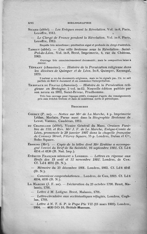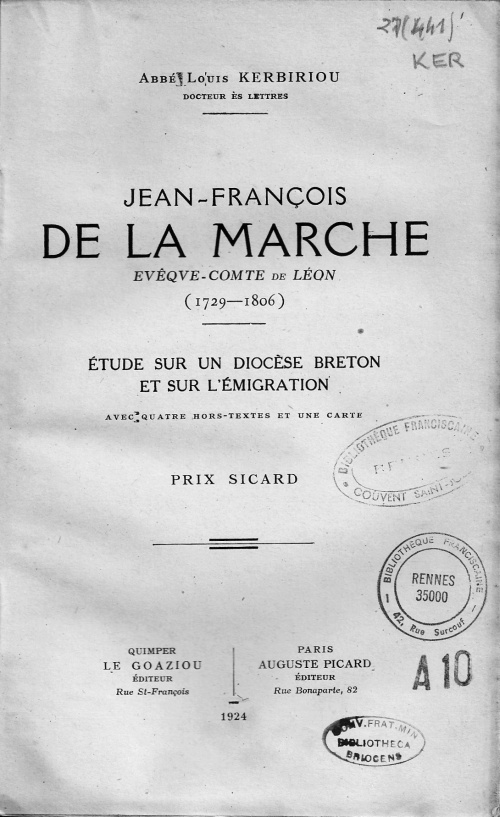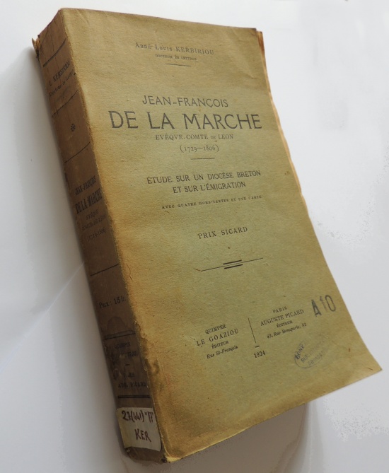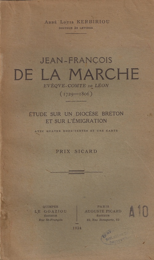 KERBIRIOU (Louis), Jean-François de la Marche Evêque-Comte de Léon (1729-1806) - Étude sur un diocèse breton et sur l'émigration, Le Goaziou, Quimper, 1924, ISBN N/A
