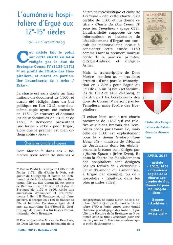 - Charte de l’aumônerie des Hospitaliers à Ergue aux 12e et 15e siècle, p. 27