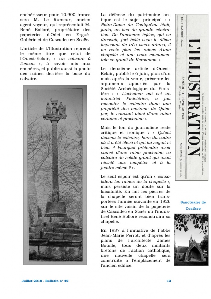 Autre témoignage, celui de l’abbé Perrot dans une correspondance de 1932 à René Bolloré pour le sanctuaire de Koat-Keo, la chapelle de Cascadec et le calvaire d’Odet.
