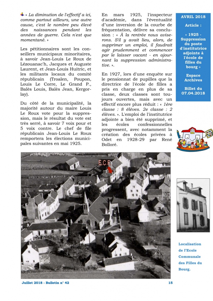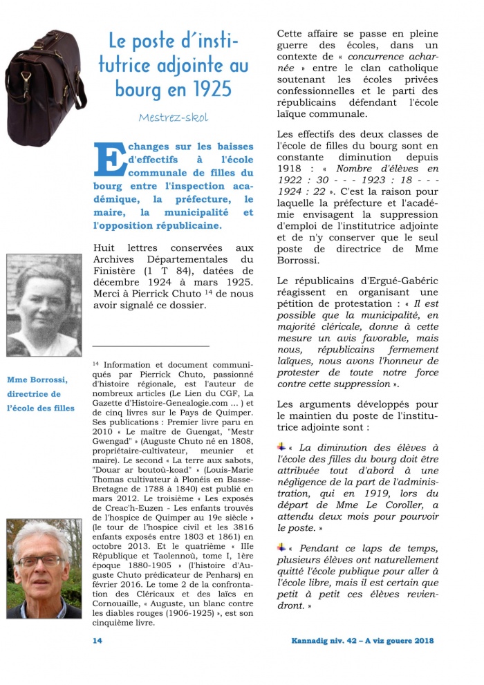 • Le poste d’institutrice adjointe menacé à l’école des filles du bourg en 1925, p. 14