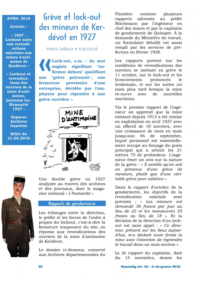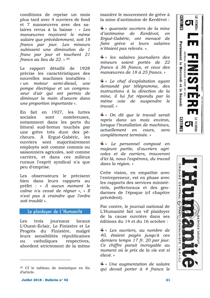 Grève et lock-out à la mine d’antimoine de Kerdévot en 1927 et la réaction du journal L’Humanité. Une légion d’honneur pour le châtelain du Cleuyou en 1865.