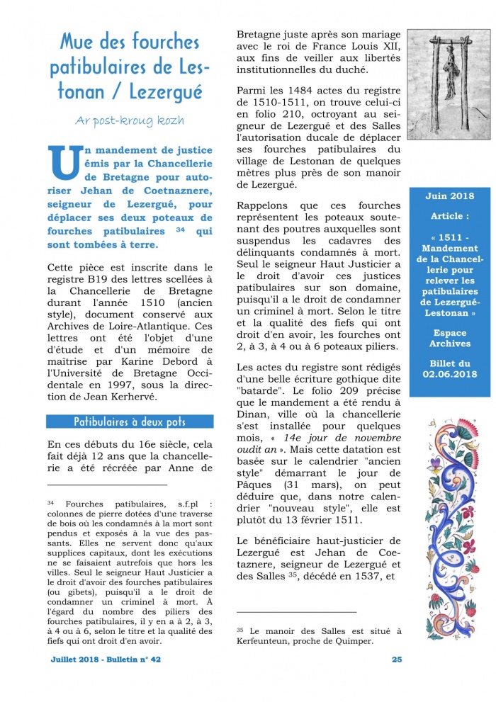 Le déplacement des fourches patibulaires de Lestonan en 1511 autorisé par la duchesse Anne de Bretagne.