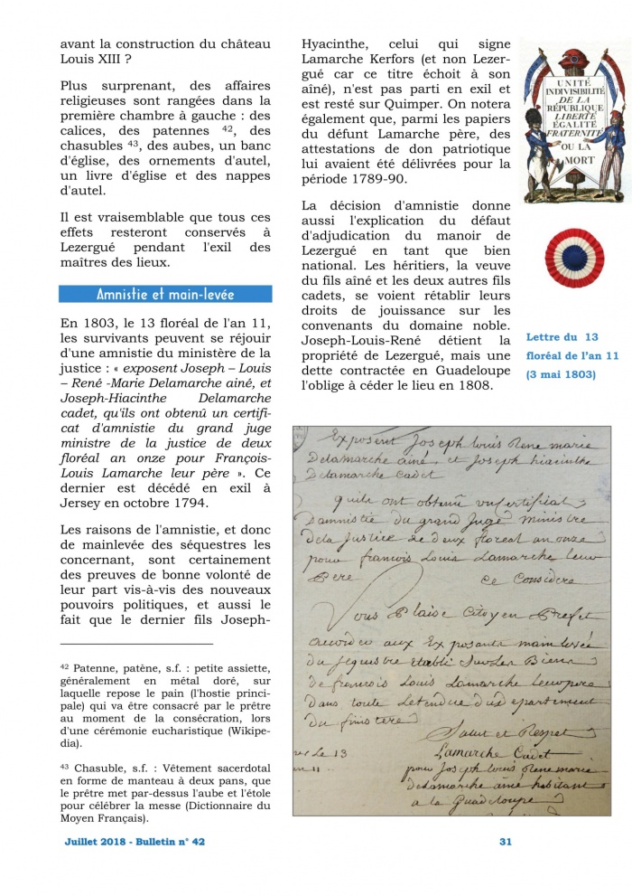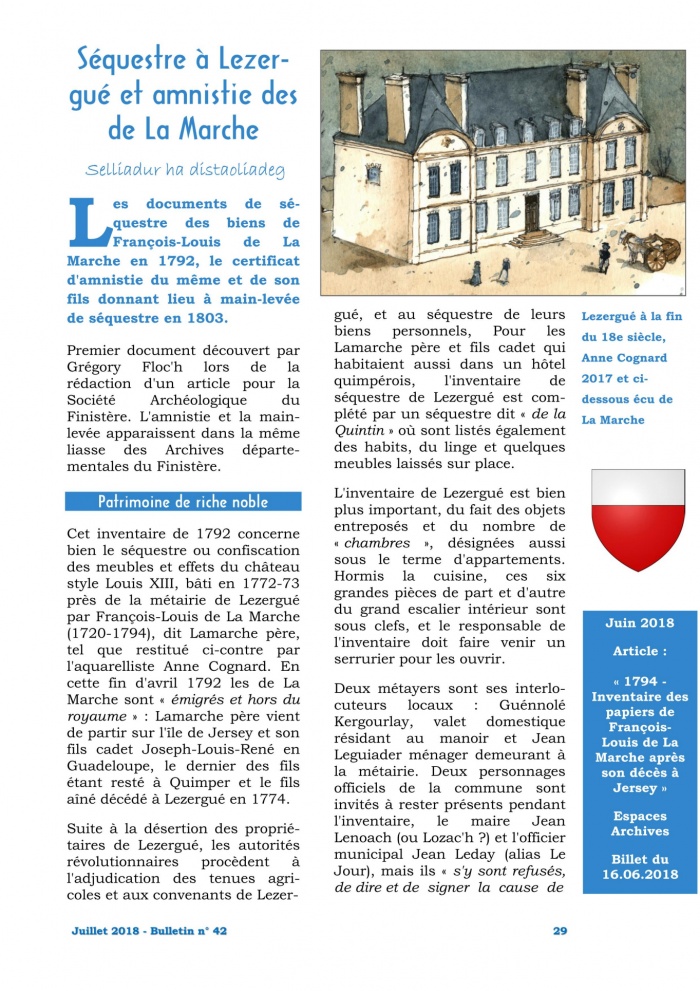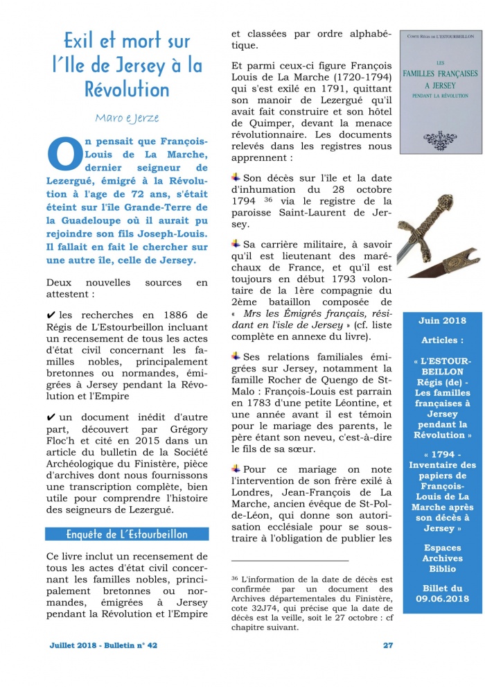 Et pour poursuivre, deux articles sur François-Louis de La Marche, dernier occupant noble de Lezergué à la Révolution : le premier sur son exil et sa mort à Jersey, le deuxième sur les séquestres du manoir, la mainlevée et son amnistie.