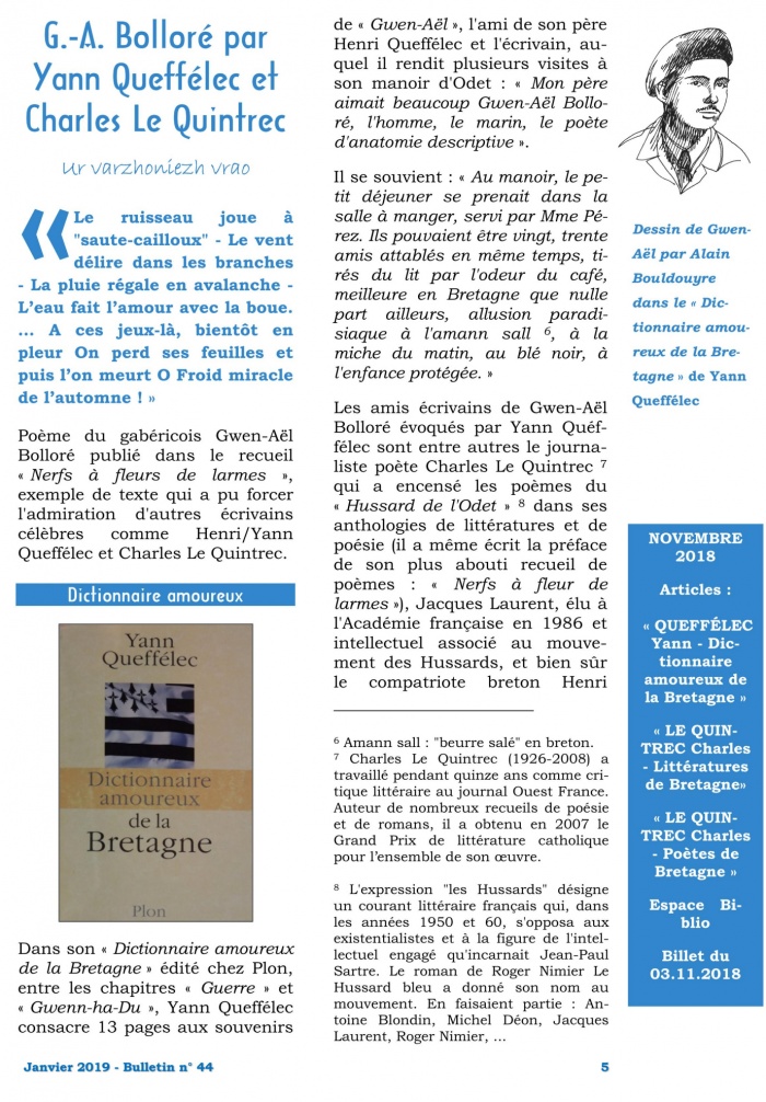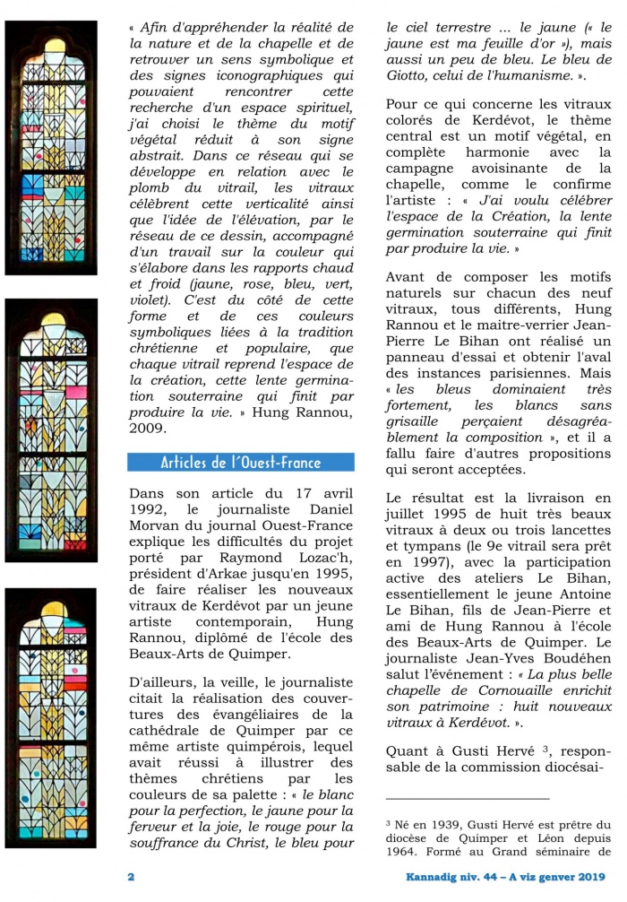 Tout d’abord un article sur les admirables vitraux contemporains et controversés de la chapelle de Kerdévot posés en 1994-97. Puis les guerres de Napoléon via ses voltigeurs et fusiliers gabéricois et une mise à jour sur la dernière patrouille du 10 novembre 1918. Déguignet est abordé au travers de ses cahiers qui viennent d’être numérisés et mis en consultation sur Internet, et aussi vu par un autre écrivain, Hervé Jaouen. Côté Bolloré, c’est la procession de la Fête-Dieu en 1918, une double généalogie familiale, des arbres qui seront bientôt les plus hauts de France, et le cri de la S.F.I.O et du comité de défense laïque en 1927. Deux documents inédits sur la famille noble Rozerc’h du manoir de Pennarun, respectivement en 1594 et 1617. Et pour finir ce bulletin, une histoire de gilet jaune le 1er mai 1934 à Paris, non pas sur les Champs-Elysées, mais rue Nationale, aux abords de la cité Jeanne-d’Arc. Par ailleurs les annales 2018 sont toujours disponibles au prix de 17 euros. Et on a déjà démarré la préparation des annales de 2019 qui seront normalement prêtes plus tôt dans le courant de l’année. Bloavezh mat d’an holl, JeanQue 2019 soit une année belle et innovante. Feu !! A-raok !! |