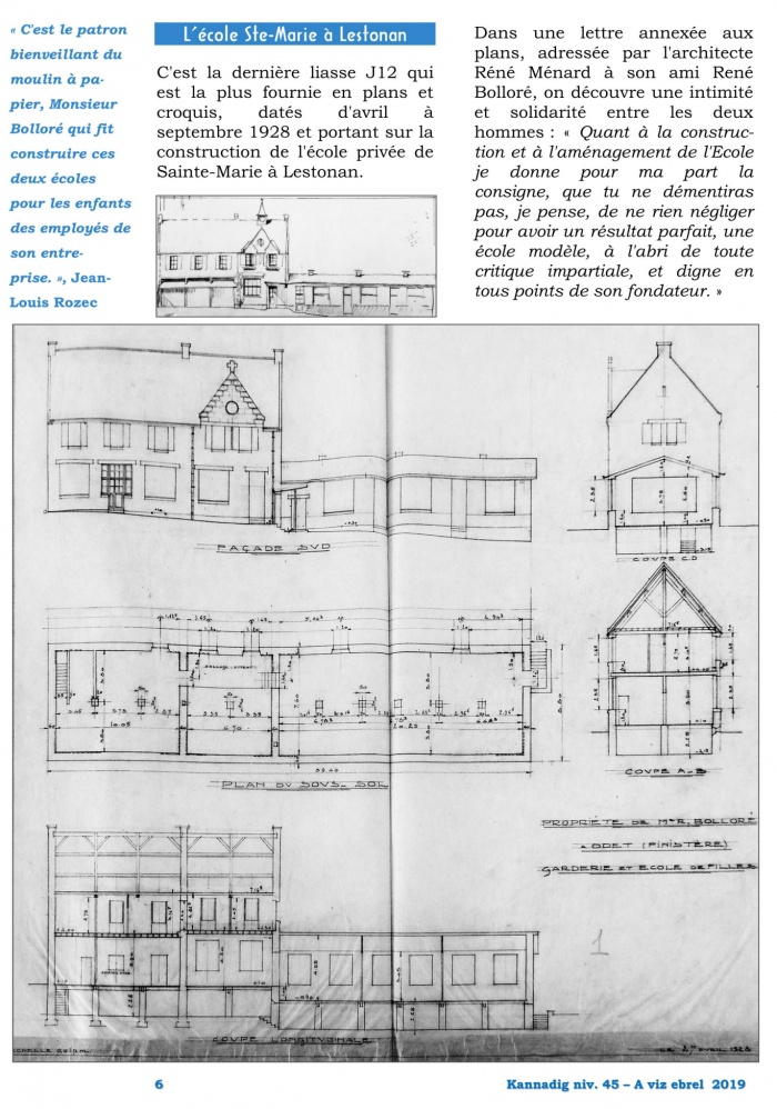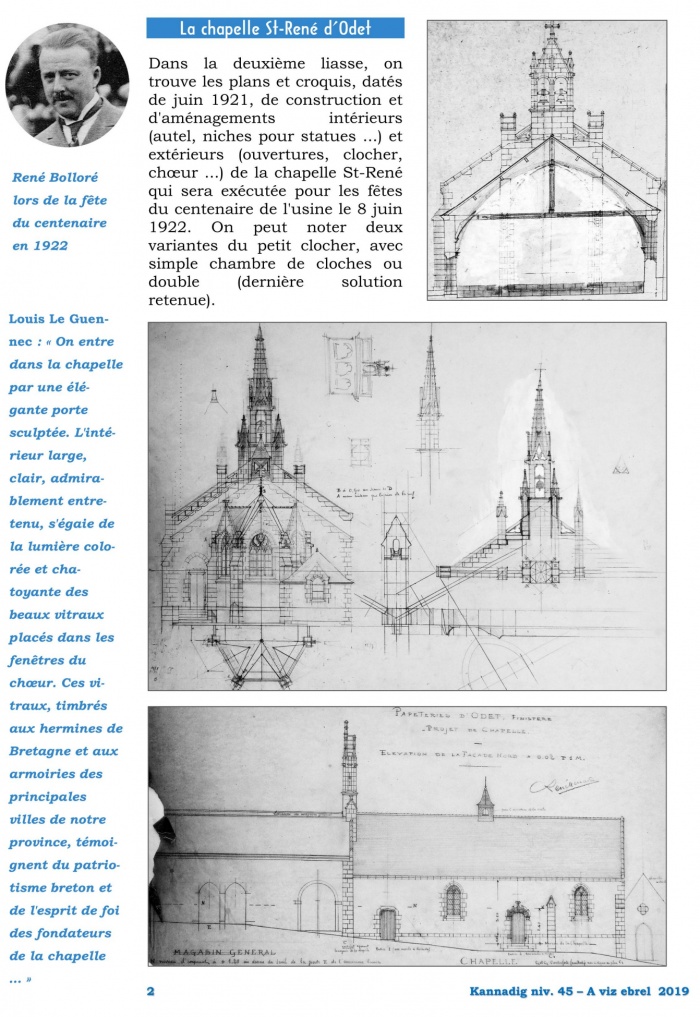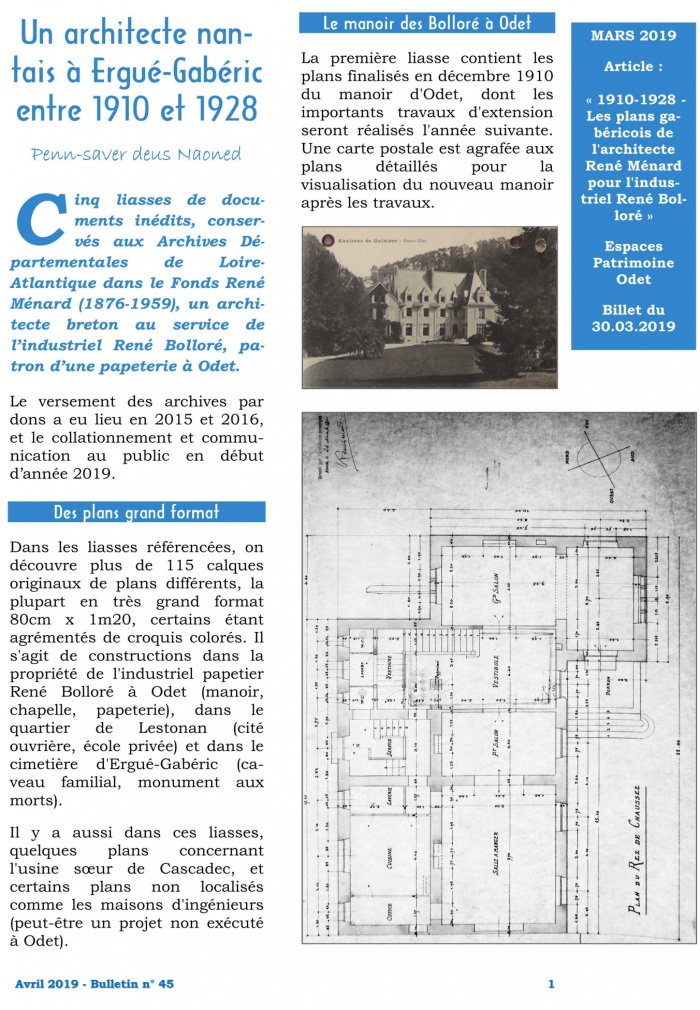 Pour commencer, un article sur les plans inédits de l’architecte René Ménard, ami nantais de René Bolloré et chargé par lui de la conception d’un nouveau manoir, chapelle, conciergerie, cité ouvrière, tombe familiale, monument aux morts et école privée.