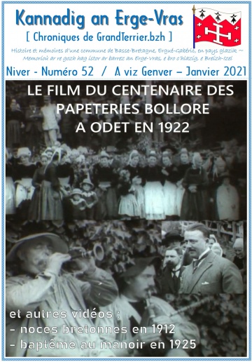 Vidéos, mémoires, archives et patrimoine Ce bulletin des articles publiés sur le site du Grand Terrier au cours du dernier trimestre 2020 démarre par cinq vidéos et une émission de radio : le centenaire des papeteries Bolloré, des noces bretonnes en 1912, le baptême de Gwenn-Aël et le roman d’amour des Naufrageurs, le reportage sur la cité de Ker-Anna, et enfin une chronique radio sur un crime de 1930. Quant aux mémoires d’ancien, on saluera le militant René Huguen et ses souvenirs du Front Populaire. Les documents d’archives sont nombreux dans ce bulletin : le 18e siècle avec le ma-noir de Griffonez et une pétition en faveur des domaines congéables ; le 19e siècle avec le domaine de la légion d’honneur, l’épidémie de variole et la maison de maître de Kervéady. Et enfin le patrimoine : l’avant-dernier article traite de l’ouverture au public du site de la carrière de Kerrous, le dernier porte sur la place de la future mairie qui sera inaugurée prochainement. Une proposition de drapeau municipal trouvée sur le site drapeauxbzh, avec une variante de déport des croisettes par rapport à l’écu héraldique des Cabellic, les fondateurs de la commune. |