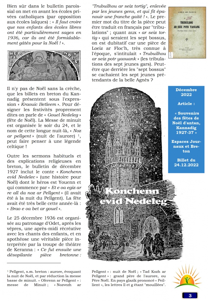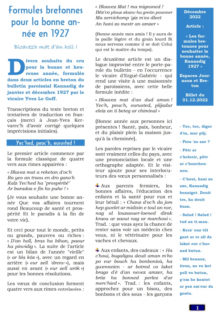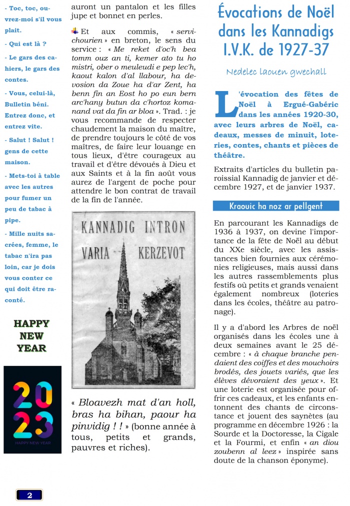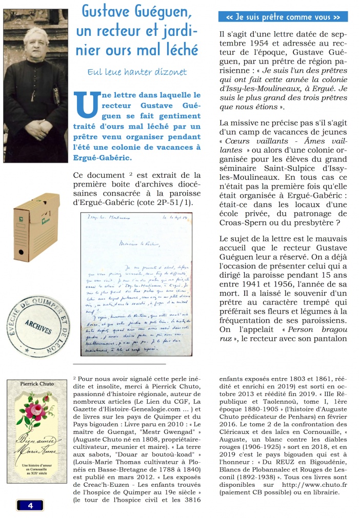 Vœux, paroisse, engagement, archives et belles pierres En ce mois de janvier, on démarre par les bons vœux, ceux que le vicaire Yves Le Goff adressait déjà en 1927 à ses paroissiens. Ensuite on reste dans la paroisse : l’évocation des fêtes de Noël en 1927-37, et plus proche de nous un portrait peu flatteur du recteur Gustave Guéguen en 1954. Il est aussi question de l’engagement volontaire du soldat Déguignet en 1854. Le cœur du présent bulletin est consacré à la suite et fin des travaux d’inventaire d’archives entamés à la fin de l’été dernier :