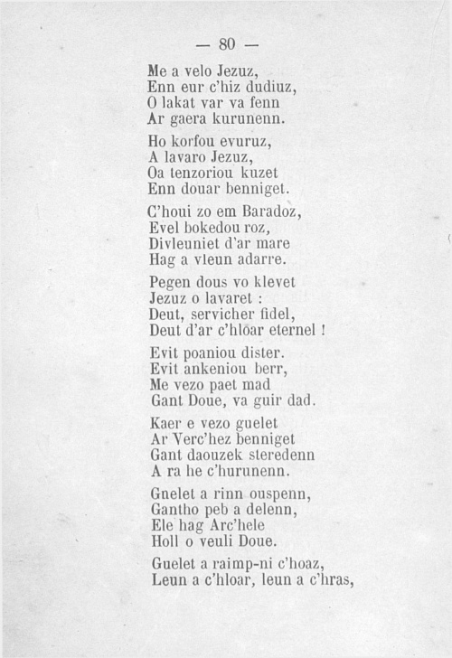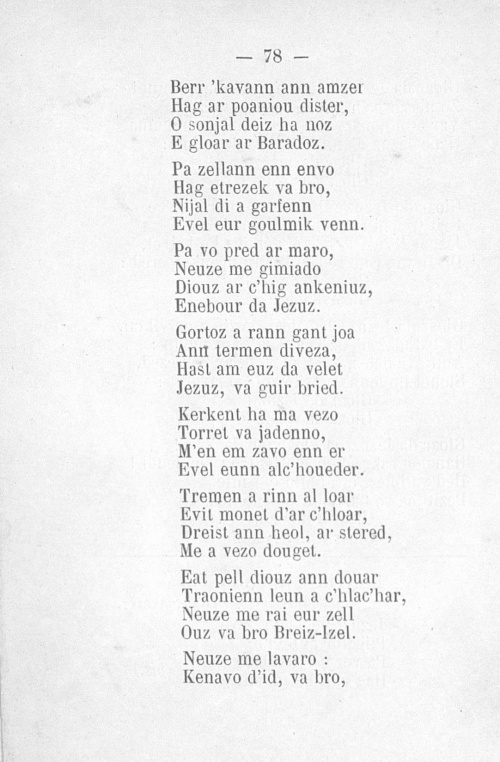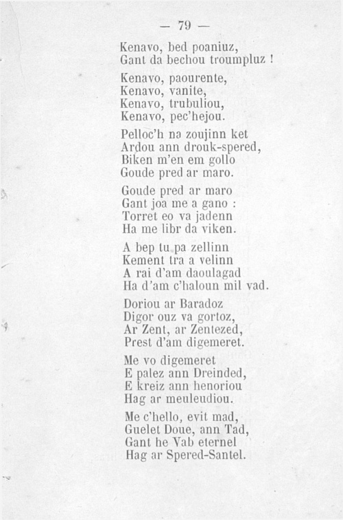 complaintes sur les miracles opérés par les saints et les saintes, complaintes sur les crimes commis par des impies sur les choses sacrées et les punitions effroyables infligées immédiatement aux criminels, complaintes sur l'enfer et le purgatoire, complainte des morts (an Nanaon) et des ossements des cimetières, etc. etc. Et dans les derniers couplets de toutes ces complaintes, il est toujours fait appel à la bourse des ouailles pour dire des messes pour la conversion des impies et des hérétiques et pour la délivrance des âmes du purgatoire, surtout pour les âmes abandonnées (evit an Nanaon abandonet).