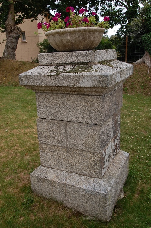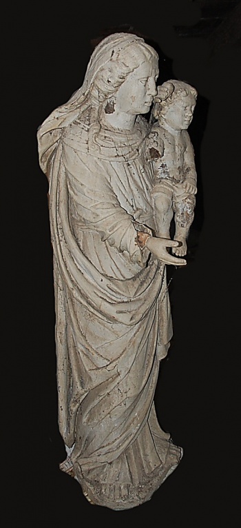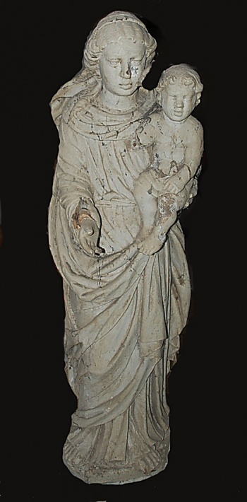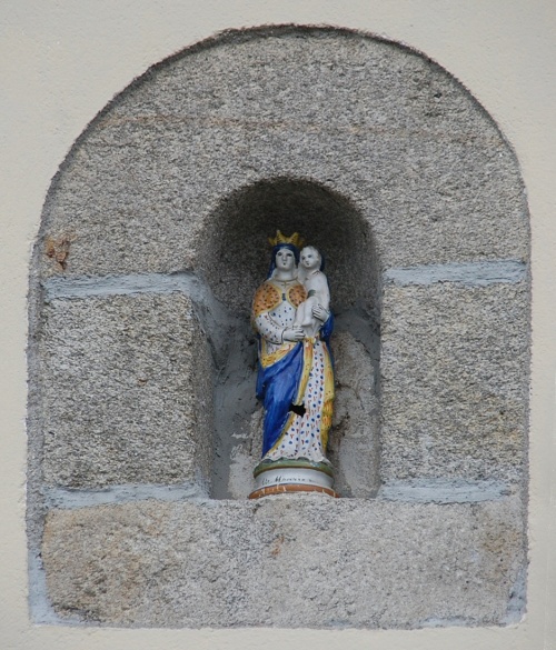 On peut voir encore aujourd'hui sur le terrain proche de l'ancien patronage le socle de pierre qui soutenait cette grande statue. La Vierge à l'enfant était quant à elle probablement exposée à l'intérieur du patronage (et de plus, son dos en creux n'aurait pas été très élégant pour une exposition extérieure). Parmi les autres statues cachées dans la cheminée, celle du saint en bois polychrome, plus petite, fut donnée à Paul Eon, vicaire et aumônier d'Odet jusqu'en 1949, lequel de son côté la rétrocéda à une autre famille résidente d'Ergué-Gabéric. Les statues de plâtre furent par contre détruites, car abimées et dénuées de valeur. La rétrospective des statues du patronage de l'Hôtel serait incomplète si l'on ne mentionnait pas la petite statue de Vierge à l'enfant en faïence émaillée qui orne la niche en hauteur sur le mur Est du patronage. Elle était déjà là au début du 20e siècle, et en y regardant de plus près on peut remarquer la trace d'un trou de plomb de carabine. C'est un jeune chasseur qui, avant guerre, tira sur la statue par jeu et défi. Bien mal lui prit, car ce geste accompli il n'eut de cesse d'y penser et d'être obsédé par l'idée de punition divine. |