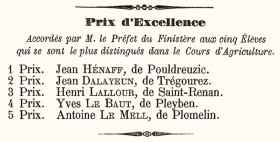 Ce professeur,né en 1819 à Saint-Pierre-Canivet (Calvados), a étudié à l’école d’agriculture de Rennes, puis à l’institution royale de Grignon En 1874, il devient même maire de Kerfeunteun, une commune dans laquelle il exploite la ferme de Kermahonnet sur laquelle il donne les leçons pratiques de la Chaire d’agriculture. Une enquête faite en 1899 montre l'importance locale de la section agricole créée par le professeur Olive : « Si l’on consulte aujourd’hui l’annuaire du département du Finistère pour l’année 1899, on relève les noms de 74 maires, 97 adjoints, 10 conseillers d’arrondissement et 2 conseillers généraux, anciens élèves de la section agricole du Likès ». Soit par exemple en 1875 : le 1er prix d’excellence du cours d'agriculture |
