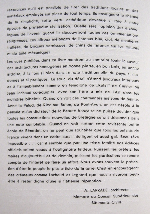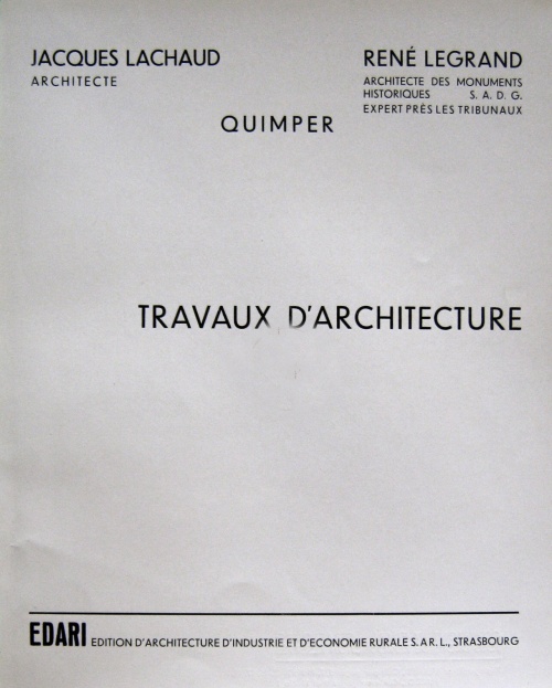 | Brochure présentant différents travaux réalisés en Cornouaille dans les années 1920-30 par les deux architectes quimpérois René Legrand et Jacques Lachaud, avec 9 planches photographiques et une introduction d'Albert Laprade [1].