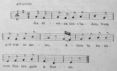 Cet inventaire de chansons bretonnes populaires publié en 1911 est un trésor de conservation du patrimoine musical populaire du 19e et 20e siècles. Parmi les 35 principaux chants recensés par l'imprimeur Hyppolite Laterre et le linguiste Francis Gourvil figure le chant de soldat, « Kanaouenn soudard », où les soldats prêts à partir pour Alger en 1840 s'émeuvent de quitter les lieux de pardon du pays de Cornouaille, dont la chapelle gabéricoise de Kerdévot. Le chant est rapporté par Pauline Le Moal de Carhaix, et les auteurs signalent une autre publication dans la revue « Ar Vro » par l'abbé Guillerm. On se reportera à la présentation de ce même chant collecté par Gabriel Milin en 1961 pour en connaître le contexte historique et local. L'originalité de l'édition Laterre-Gourvil est d'en produire la partition mélodique, et une traduction des 6 complets en français (cf transcription ci-après). A partir de cette partition, voici une interprétation à la flûte traversière en bois (© GC Gières 38) :