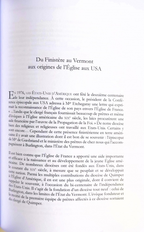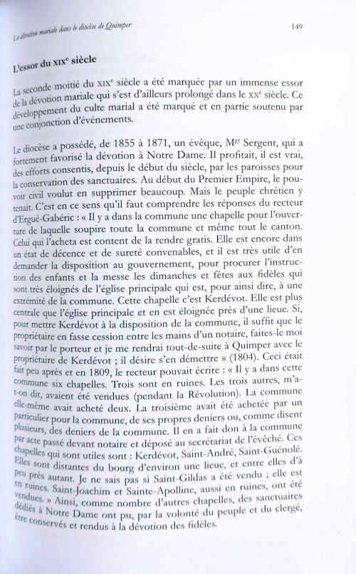 Le chanoine Jean-Louis Le Floc'h était archiviste diocésain, et à ce titre il s'est intéressé à l'histoire religieuse locale. Le présent livre rassemble un certain nombre d'articles portant sur l'histoire du diocèse de Quimper pendant la Révolution et au XIXe siècle. Pour la Révolution quelques notes évoquent les deux personnalités gabéricoises d'Alain Dumoulin (prêtre réfractaire) et Jean-François de La Marche (évêque de l'Evêché du Léon, émigré à Londres). Pour ce qui concerne le XIXe siècle on notera l'affaire de la restitution de la chapelle de Kerdévot (p. 149) et la personnalité de Pierre-Jean Le Calvez, premier instituteur d'Ergué-Gabéric missionnaire aux USA (p.164). Pages 149, 158-168 : JLLF-Diocèse.pdf, avec cet exergue pour P.J. Le Calvez : « Pierre-Jean Le Calvez, de Plobannalec (Plonivel), prêtre de 1854 et instituteur au Grand-Ergué. Il entrera, en 1890, au monastère d'Oka, près de Montréal où il est mort le 27 mars 1907. » Pages 161-168 traduites en anglais : FromFinisteretoVermont.pdf, en ligne sur le site [1] : « Pierre-Jean Le Calvez, Plobannalec (Plonivel), priest of 1854 and teacher at Grand Ergue. He entered the monastery of Oka near Montreal in 1890, where he died on March 27, 1907. » Autres lectures : « Pierre-Jean Le Calvez, prêtre et instituteur (1854-1855) » ¤ « DUIGOU Serge - La vie romanesque de Pierre-Jean Le Calvez » ¤ « 1849-1856 Ouverture de la première maison d'école communale au Bourg » ¤ « 1833-1850 - Positions municipales sur la loi Guizot d'instruction primaire » ¤ « 1804-1814 - Enquêtes diocésaines sur l'état de la paroisse d'Ergué-Gabéric » ¤ | |||||
