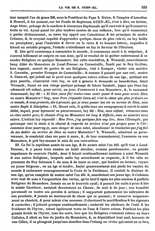 II. Dés qu'il commença à connoistre le monde, il commença aussi à le mépriser, & s'accrut tellement ce mépris en son Ame, qu'il se resolut de le quitter entierement & se rendre Religieux en quelque Monastere. Sur cette resolution, S. Wennolé, nouvellement beny Abbé du Monastere de Land-Tevenec en Cornouaille, fondé par le Roy Grallon, lors regnant, assisté de quatre de ses Religieux, vint à Kemper, visiter son maistre S. Corentin, premier Evesque de Cornouaille ; & comme il passoit par une rue, nostre S. Guen-ael, qui jouoit sur le pavé avec quelques autres enfans de son âge, quittant ses jeux puerils, s'encourut vers luy, se mit à genoux & demanda sa benediction. Saint Wennolé, lisant en son visage quelque présage de future Sainteté, jugea que Dieu luy adressait cet enfant, pour servir, un jour, d'ornement à son Monastere, &, le caressant doucement, luy dit : « Et bien (mon fils) voulez-vous venir quant & nous pour servir Dieu en nostre Monastere ? Ouy, mon Pere (répondit Guin-ael) c'est la chose que plus je desire en ce monde, & vous promets, dés à present, que je veux passer ma vie au service de Dieu, sous vostre Regle & Discipline. » Et, disant cela, il quitta tous ses compagnons & suivit le saint Abbé, lequel, pour éprouver sa perseverance, luy dit : Non, mon enfant, retournez-vous en chez vostre pere, le chemin d'icy au Monastere est long & difficile, vous ne sçauriez nous suivre. L'enfant luy répondit : Mon Pere, j'ay quelques fois ouy lire, dans l'Evangile, que quiconque met la main à la charruë & regarde en arriere n'est pas propre pour le Ciel ; comment donc pourray-je, sans danger de mon salut, abandonner la resolution que j'ay fait de me dedier au service de Dieu en vostre Monastere ? S. Wennolé, admirant sa perseverance, le conduisit chez ses pere & mere, &, de leur consentement, l'emmena en son Monastere, & prit luy-mesme le soin de son instruction.