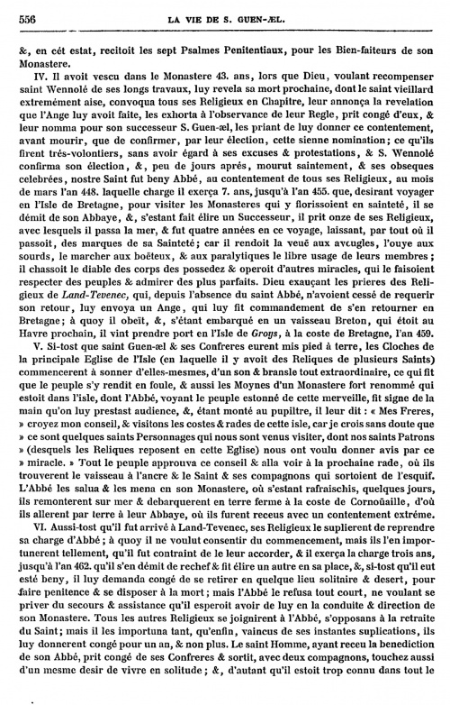 IV. Il avoit vescu dans le Monestre 43 ans, lors que Dieu, voulant recompenser saint Wennolé de ses longs travaux, luy revela sa mort prochaine, dont le saint vieillard extremément aise, convoqua tous ses Religieux en Chapitre, leur annonça la revelation que l'Ange luy avoit faite, les exhorta à l'observance de leur Regle, prit congé d'eux, & leur nomma pour son successeur S. Guen-ael, les priant de luy donner ce contentement, avant mourir, que de confirmer, par leur élection, cette sienne nomination; ce qu'ils firent trés volontiers, sans avoir égard à ses excuses & protestations, & S. Wennolé confirma son élection, &, peu de jours après, mourut saintement, & ses obseques celebrées, nostre Saint fut beny Abbé, au contentement de tous ses Religieux, au mois de mars l'an 448 laquelle charge il exerça 7 ans, jusqu'à l'an 455 que, desirant voyager en l'Isle de Bretagne, pour visiter les Monasteres qui y florissoient en sainteté, il se démit de son Abbaye, &, s'estant fait élire un Successeur, il prit onze de ses Religieux, avec lesquels il passa la mer, & fut quatre années en ce voyage, laissant, par tout où il passoit, des marques de sa Sainteté ; car il rendoit la vouë aux aveugles, l'ouye aux sourds, le marcher aux boëteux, & aux paralytiques le libre usage de leurs membres ; il chassoit le diable des corps des possedez & operoit d'autres miracles, qui le faisaient respecter des peuples & admirer des plus parfaits. Dieu exauçant les prieres des Religieux de Land-Tevenec, qui, depuis l'absence du saint Abbé, n'avoient cessé de requerir son retour, luy envoya un Ange, qui luy fit commandement de s'en retourner en Bretagne ; à quoy il obéit, &, s'étant embarqué en un vaisseau Breton, qui étoit au Havre prochain, il vint prendre port en l'Isle de Groys, à la coste de Bretagne, l'an 459.