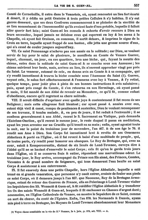 VII. Ce saint Personnage n'acheva pas son année dans la solitude ; car Dieu, se voulant servir de luy pour le salut de plusieurs, le manifesta au Comte de Venues Guerec, lequel, chassant, un jour, en ces quartiers, leva une biche, qui, fuyant la meutte des chiens, entra dans la solitude de saint Guen-ael & se coucha sous son Aumusse ; les chiens suivirent leur beste, mais, arrivez au lieu, ils n'oserent approcher vingt pas prés du Saint. Le venneur, estonné de cela, en donna avis au Comte & à sa compagnie, qui s'y rendit incontinent & trouva la biche couchée sous l'Aumusse du Saint [2]. Guerec, voyant cela, le salua fort affectueusement & l'emmena avec luy à Vennes, & l'y retint, quelque temps, pour jouir plus à plein de ses bonnes instructions & avis salutaires ; puis, ayant pris congé du Comte, il s'en retourna en son Hermitage, où ayant passé 9 mois, il fut mandé de son Abbé de revenir au Monastere, ce qu'il fit, comme enfant d'obedience, encore qu'il regretast sa chere solitude.