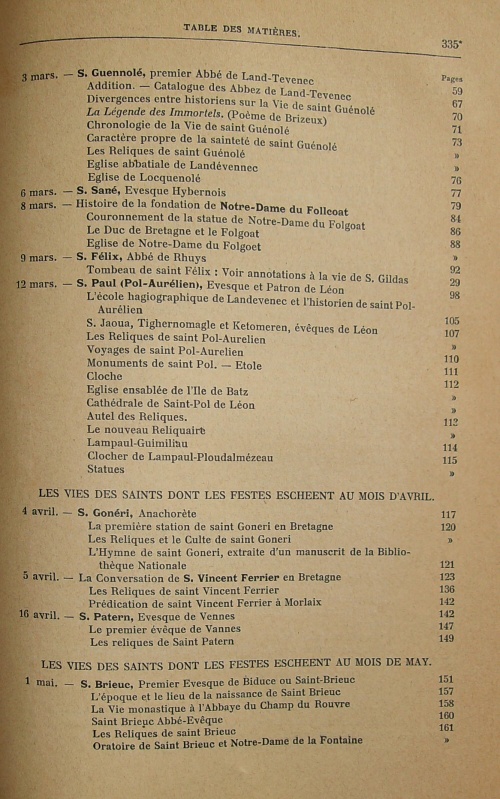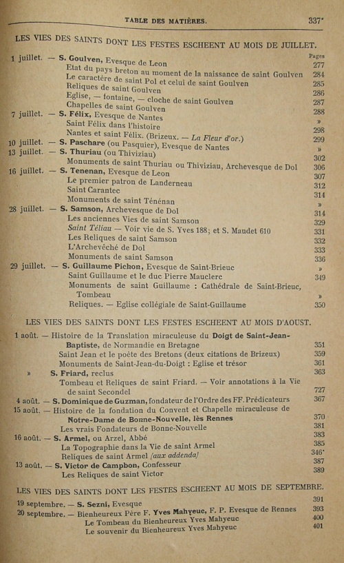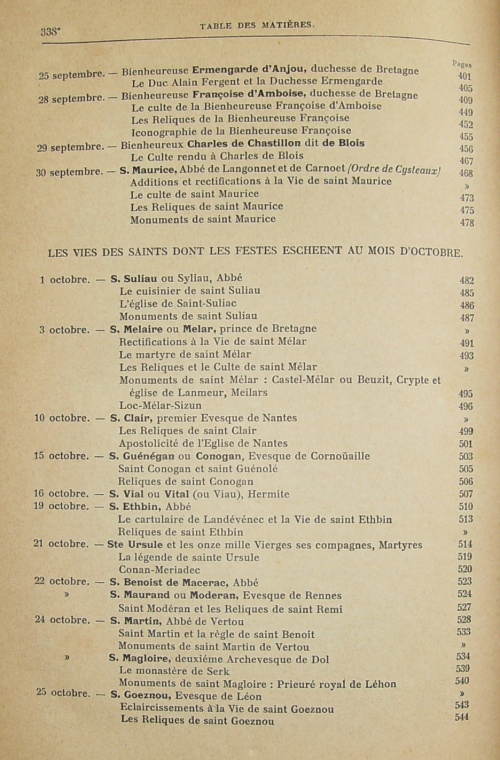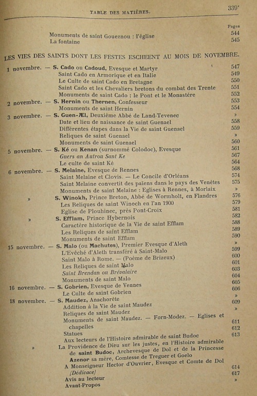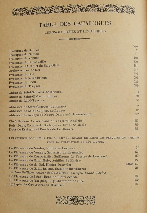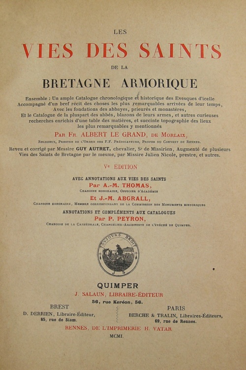 Les Vies des Saints de la Bretagne Armorique, ensemble un ample catalogue chronologique et historique des evesques d'icelle, accompagné d'un bref récit des choses les plus remarquables arrivez de leurs temps ; Avec les Fondations des Abbayes, Prieurez, et Monasteres, et le Catalogue de la plus part des Abbez, Blazons de leurs Armes, et autres curieuses recherches, enrichis d'une Table des Matieres, et succinte Topographie des lieux les plus remarquables y mentionnez, par Fr. Albert Le Grand, de Morlaix, Religieux, Prestre de l'Ordre des FF. Predicateurs, Profez du Couvent de Rennes ; reveu, corrigé et augmenté, de plusieurs Vies des Saints de Bretagne en cette troisième Edition, par Messire Guy Autret chevalier, Sr de Missirien, et autres.