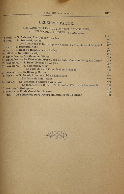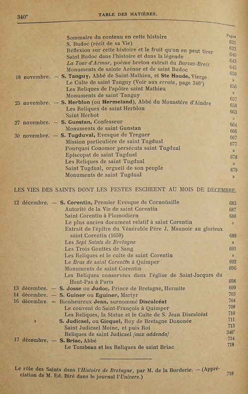 Ayant, plus que personne, ressenti ces affections, goûté ces ravissements, le bon chevalier prit en main la réédition des Vies des Saints de la Bretagne Armorique, et la mena à bonne fin. Outre des notes, des corrections et d'importantes additions aux Vies déjà publiées, il joignit à celles-ci les légendes : 1° de saint Budoc, par Albert Le Grand, 2° de saint Bieuzy et du Vénérable Frère Jean de Saint-Samson, qu'il écrivit lui-même, 3° de saint Béat, de saint Colomban, de saint Marcoul, de sainte Osmane, de saint Paterne, de saint René et de saint Colombel, par Dom Julien Nicole, prêtre originaire du pays de l'Argoët, 4° de saint Hélier, par J. Lambaré. Suivaient deux tables, dont la plus étendue était due à Julien Nicole.
