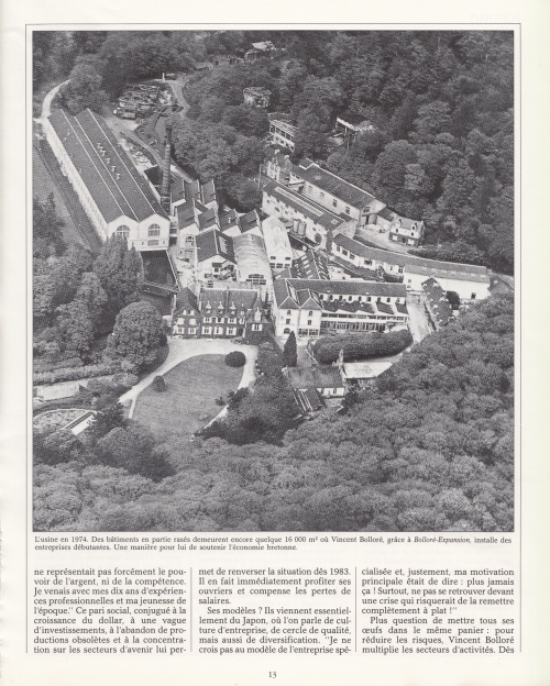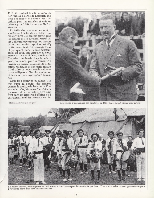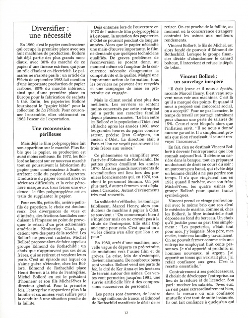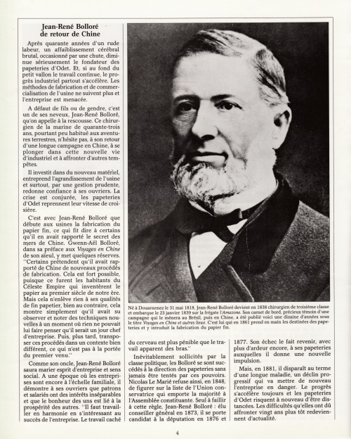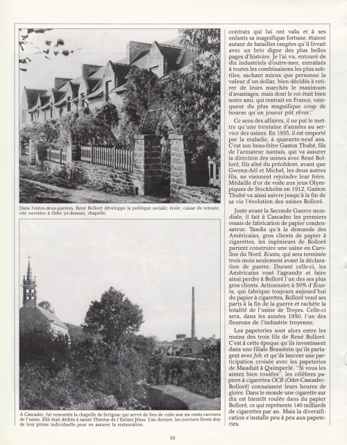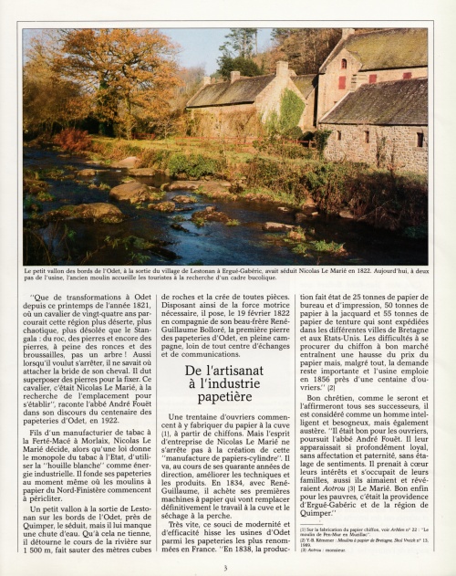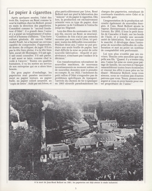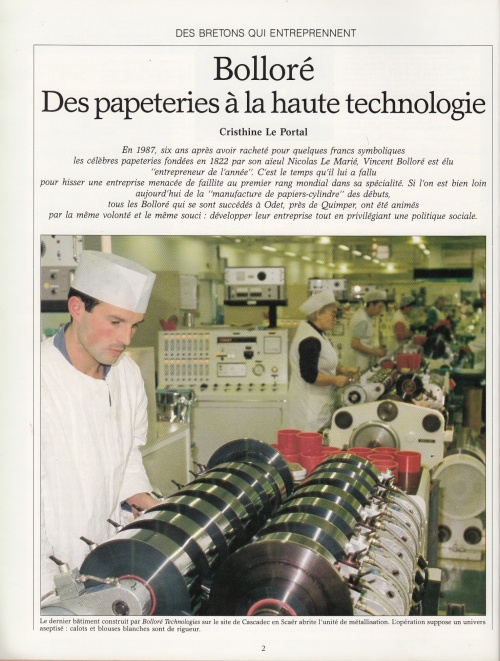 Un article bien documenté retraçant l'histoire de la papeterie depuis 1822 jusqu'à la reconversion dès 1972 au film polyppropylène, avec cette introduction : « En 1987, six ans après avoir racheté pour quelques francs symboliques, les célèbres papeteries fondées par son aïeul Nicolas Le Marié, Vincent Bolloré est élu "entrepreneur de l'année" ». Les premières pages de 4 à 2, agrémentées de photos d'archives en noir et blanc, constituent une rétrospective des sites industriels d'Odet et de Cascadec. Autres lectures : « La création de la manufacture d'Odet et ses fondateurs » ¤ « BOLLORÉ René - Livre d'or des papeteries » ¤ « ANDRÉ-FOUET Edouard (abbé) - Discours des Fêtes du Centenaire » ¤ « GOULM Yves - Micheriou koz : Les papetiers d'Odet et de Cascadec » ¤ | |||||